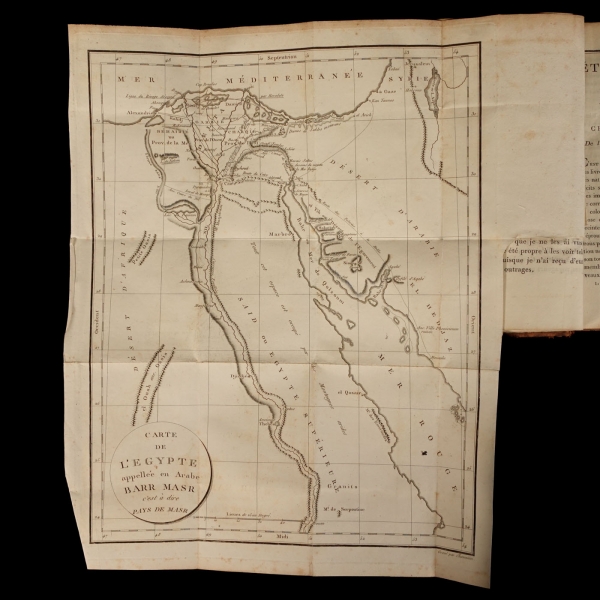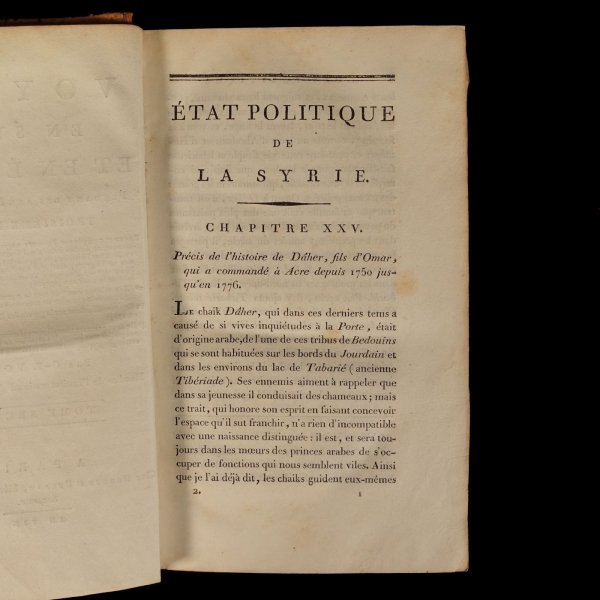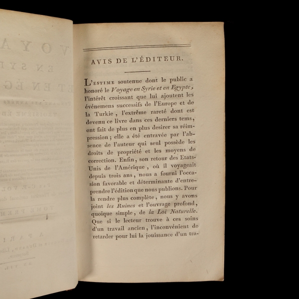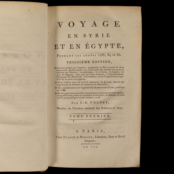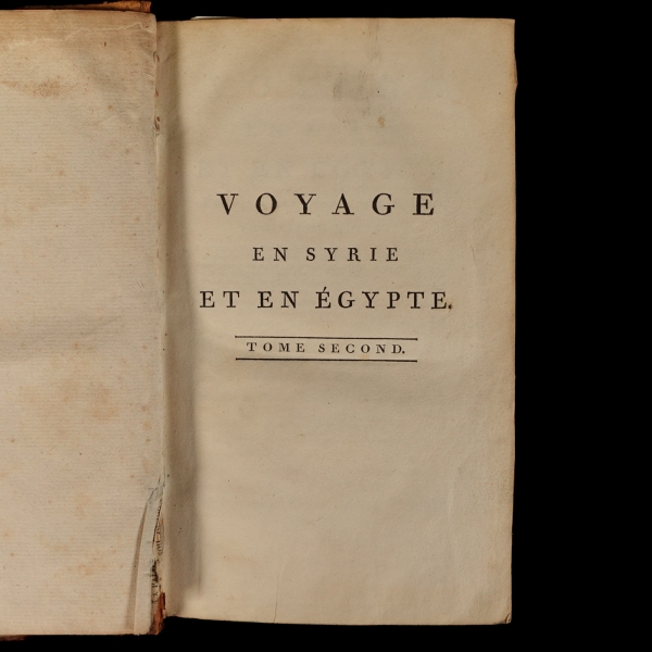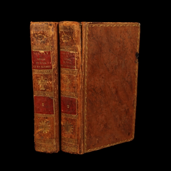Fransız filozof, tarihçi, doğubilimci ve politikacı Constantin François de Chasseboeuf´un Suriye ve Mısır seyahatnamesi... 1. cilt: 2 katlanır harita, 2 katlanır gravür. 2 cilt: 1 katlanır harita, 3 katlanır plan, 2 katlanır gravür. Sırtları altın yaldız dekorlu, ön ve arka kapakları altın yaldız çerçeveli, tümüyle deri dönem ciltlerinde. İç kapakları ve sayfa kenarları altın yaldızlıdır. Kitabın içinde Volney'in kendi el yazısı ile düzeltmesi mevcuttur. *İkinci cildin sırtında açılma mevcuttur.