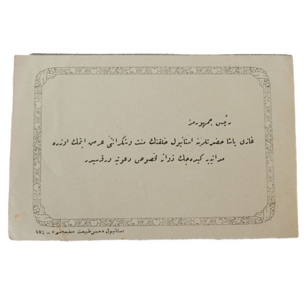 Taksim Cumhuriyet Abidesi açılış töreni kartında yazanlar: "Mübeccel Reisicumhurumuz Gazi Hazretleri namına Taksim´de Cumhuriyet Meydanı´nda yapılmış olan abidenin Ağustos´un sekizinci çarşamba günü saat tam 18´de icra kılınacak resm-i küşadını maaile huzurunuzla şereflendirmenizi Abide Komisyonu Reisi İstanbul Mebusu Hakkı Şinasi Paşa rica ile kesb-i şeref eyler.