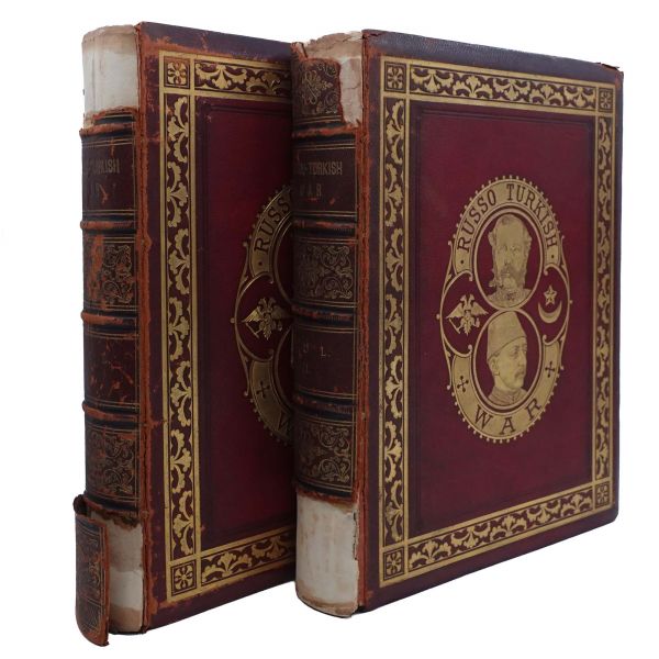 İngiliz ordu subayı Henry Montague Hozier´ın, Osmanlı tarihinde "93 Harbi" olarak bilinen 1877-1878 Türk-Rus Savaşı´nın neden ve sonuçlarını, her iki ülkenin bölgedeki çekişmelerini ele alarak irdelediği; çok sayıda gravür ve haritayla bezeli "Türk-Rus Savaşları Tarihi"... Birinci cilt: 11 gravür, 2 harita - İkinci cilt: 14 gravür, 6 harita. Kitapta yer alan Sultan V. Murad görselli portre gravürün altına, yayıncının hatası sonucu o dönem henüz yeni tahta çıkan Sultan II. Abdülhamid´in ismi yazılmıştır. Ön ve arka kapakları Rus çarı II. Aleksandr ve Osmanlı padişahı V. Murad görselli ve gofre başlıklı, sırtları panelli, altın yaldız dekor ve başlıklı orijinal deri ciltleri içinde... İç kapakları ebru desenli, sayfa kenarları altın yaldızlıdır. *Birinci cildin sırt panellerinden en üstteki, ikinci cildin sırt panellerinden en alttaki eksiktir. İkinci cildin üst sırt panelinin köşesinde zedelenme mevcuttur.