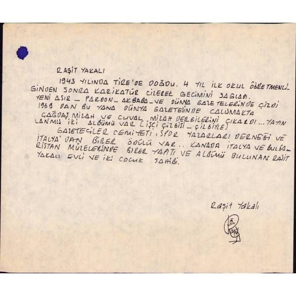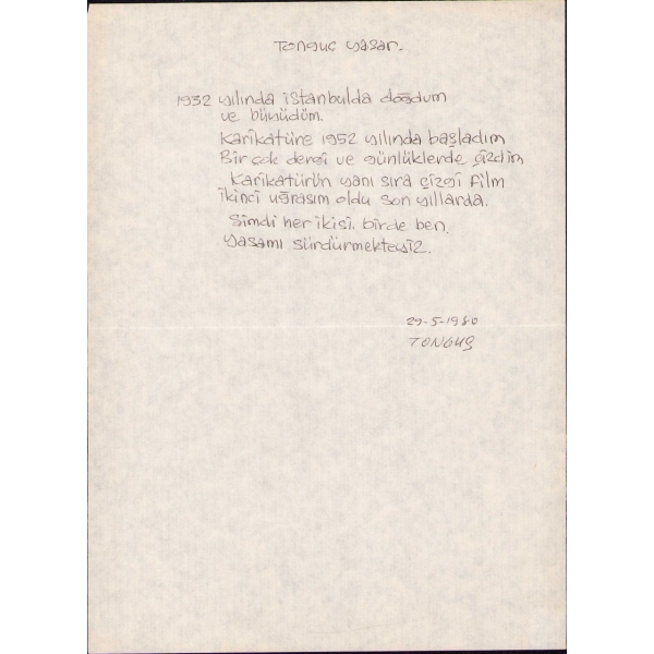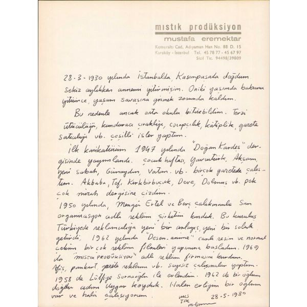 ".... İlk karikatürüm 1945'de yayınlandı. Karikatürün yanı sıra gazete ressamlığı, kitap resimlemeleri, çizgi ve reklam filmleri alanında çalıştım, çalışıyorum..."