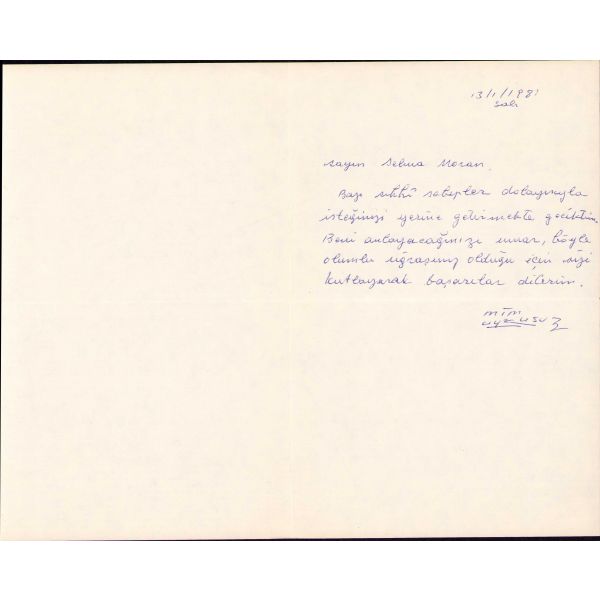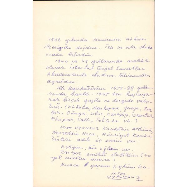"İlk karikatürüm 1937-38 yıllarında basıldı. 1945'den başlayarak birçok gazete ve dergide çalıştım.... Mim Uykusuz Karikatür Albümü, Nesreddin Hoca, Hürriyet karikatürleri adlı üç eserim var..."