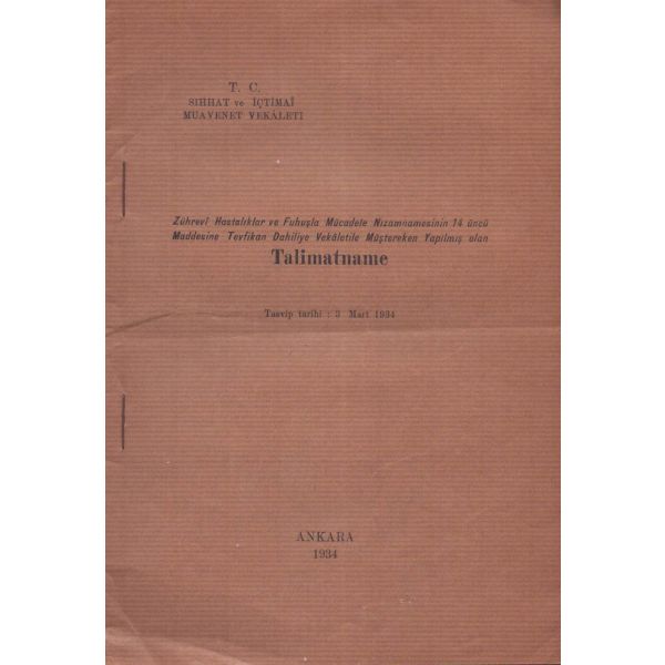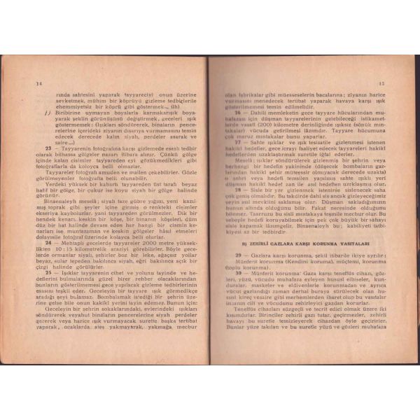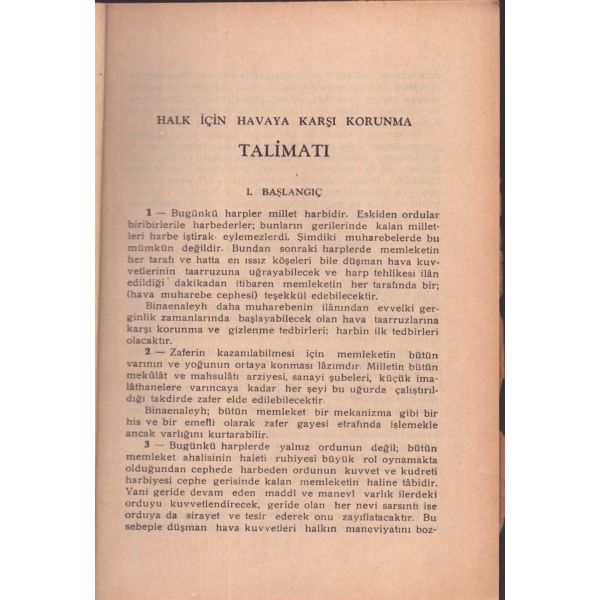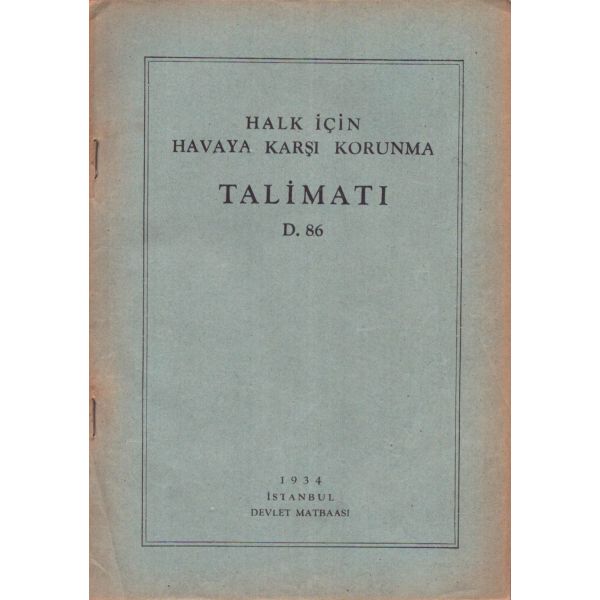 "Harp zamanında düşmanın havadan yapacağı kimyevî zehirli maddeler taarruzlarına karşı korunmayı öğreten (Halk İçin Havaya Karşı Korunma Talimatı) memlekette mevcut resmî ve hususî tekmil müesseseler ve halkça tatbik edilmek üzere neşrolunmuştur." *Arka kapağı metinden ayrılmıştır.