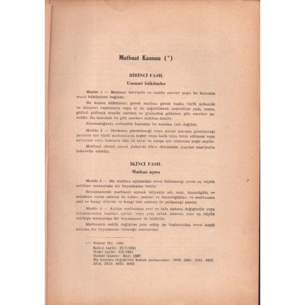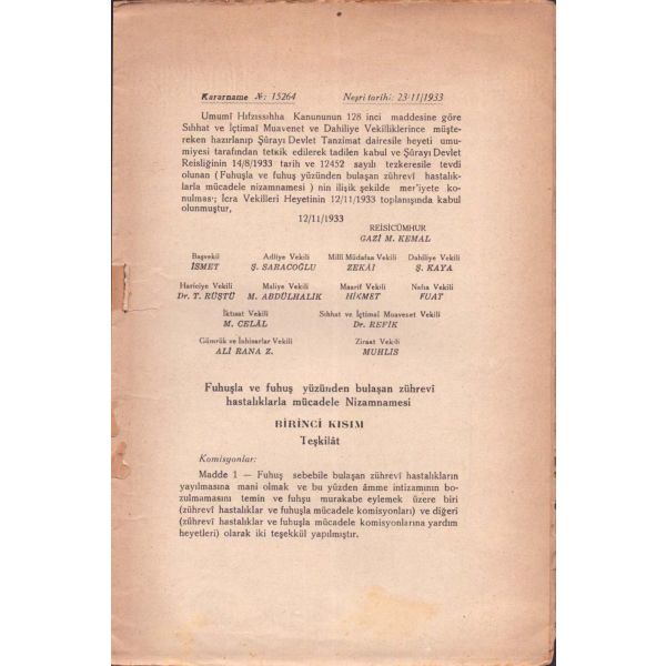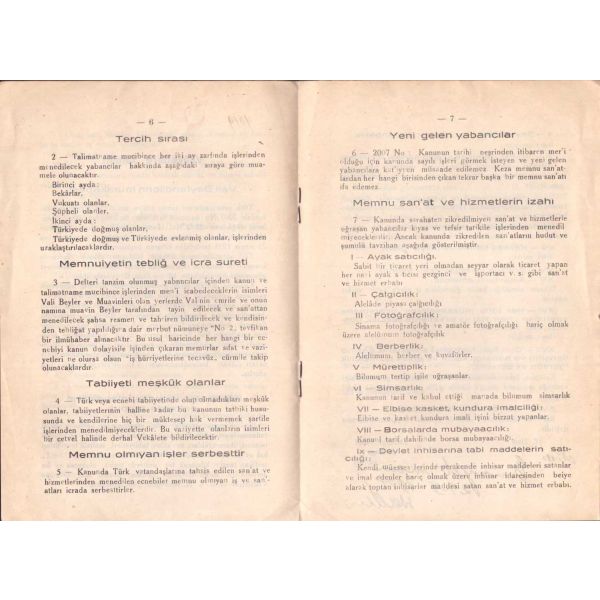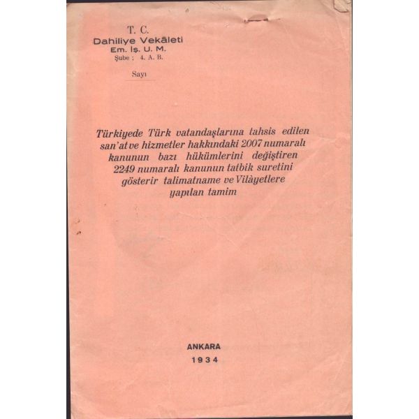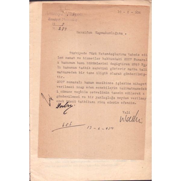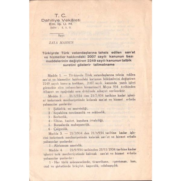 "Türkiyede Türk vatandaşlarına tahsis edilen san´at ve hizmetler hakkındaki 2007 numaralı kanunun bazı hükümlerini değiştiren 2249 numaralı kanunun tatbik suretini gösterir talimatname ve Vilâyetlere yapılan tamim" başlıklı kitapçık, T. C. Dahiliye Vekâleti tarafından 1934 yılında Ankara´da bastırılmıştır. Kitapçık içinde yer alan T. C. Amasya Vilâyeti Emniyet Memurluğu antetli ve 10 Haziran 1934 tarihli bildiri, şu ifadeleri içermektedir: Merzifon Kaymakamlığına, Türkiyede Türk Vatandaşlarına tahsis edilen sanat ve hizmetler hakkındaki 2007 Numaralı kanunun bazı hükümlerini değiştiren 2249 No.lı kanunun tatbik suretini gösterir matbu talimatnameden bir tane ilişik olarak gönderilmiştir. 2007 numaralı kanun mucibince işlerine nihayet verilmesi icap eden ecnebilerin talimatnamedeki nümune veçhile cetvelinin tanzim edilerek gönderilmesi ve bir yanlışlığa meydan verilmeyerek Hüsnü tatbikını rica ederim efendim. Vali: Kadri (Küçük)"
