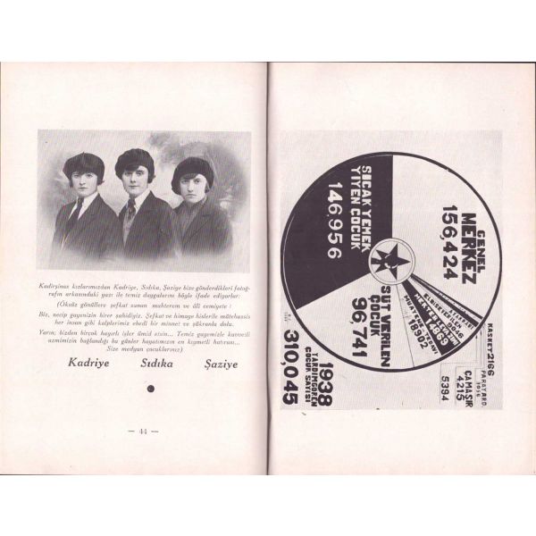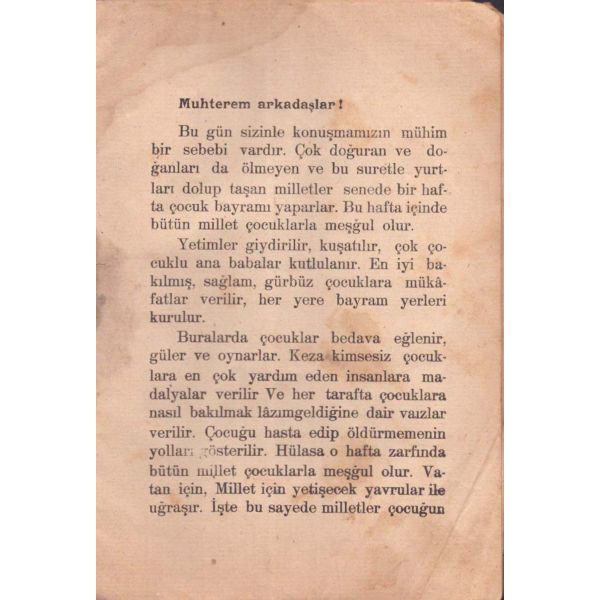 "Büyükler öldükçe anların yerlerini dolduracak çocuklardır. Eğer çocuklar da fazla fazla ölürlerse ne olur? Vatan yavaş yavaş boşalır. Halbuki vatan yavaş yavaş dolup taşmalıdır. İşte biz de memleketimizde çocuğun kıymetini her kese anlatacağız. Bizim çocuk haftamız 23 nisan günü başlar, ve bir hafta sürer. İşte bu gün, biz de sizinle konuşuyoruz. Hani köylerde, kasabalarda, şehirlerde dolaşan, yaşayan küçük Türk çocukları var ya! işte size onlardan bahsedeceğiz." *Bazı sayfaları srttan ayrılmıştır. Yorgun kondisyonda.