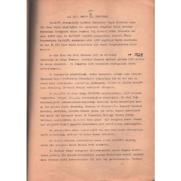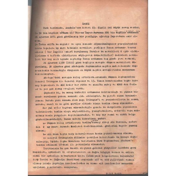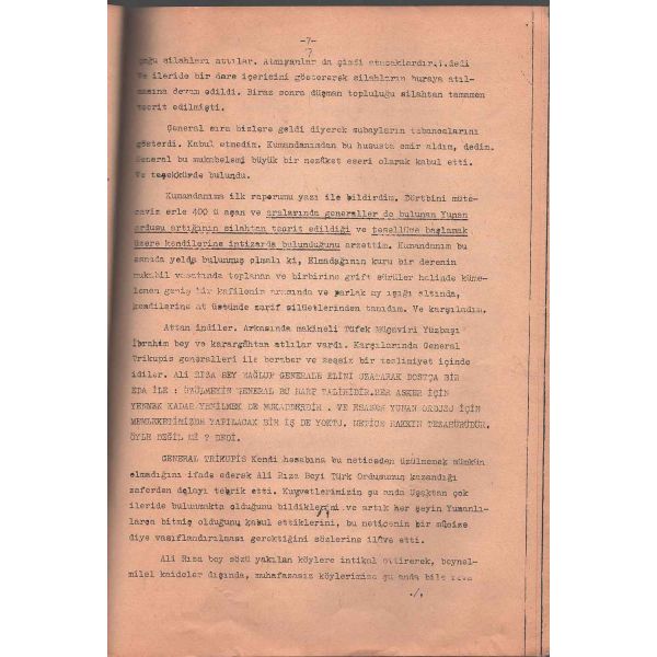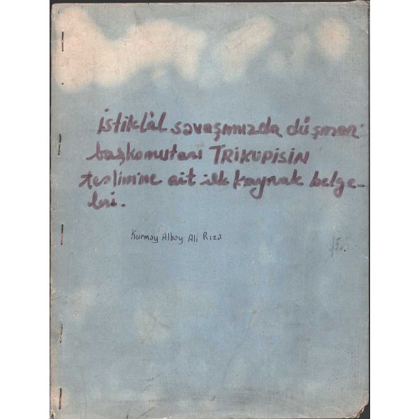 Genelkurmay Başkanlığı arşivinde yer alan belgelerin yanı sıra dönem gazete ve hatıratlarından da yararlanılarak oluşturulan derleme, Trikupis´in sayıları 4000´e yakın erle 400´ü aşan ve aralarında generaller de bulunan Yunan subaylarının silahtan tecrit edilerek 5. Kafkas Livasının (Tugayının) kumandanı Ali Rıza Bey tarafından teslim alınmasına ışık tutmaktadır. Çalışmada Ali Rıza Bey´in fotoğrafının yanı sıra kısa hal tercümesi (özgeçmişi) de yer almaktadır... "Ali Rıza Bey mağlup generale (Trikupis) elini uzatarak dostça bir eda ile: Üzülmeyin general bu harp talihidir. Her asker için yenmek kadar yenilmek de mukadderdir. Ve esasen Yunan ordusu için memleketimizde yapılacak bir iş de yoktu. Necite hakkın tezahürüdür. Öyle değil mi? dedi."