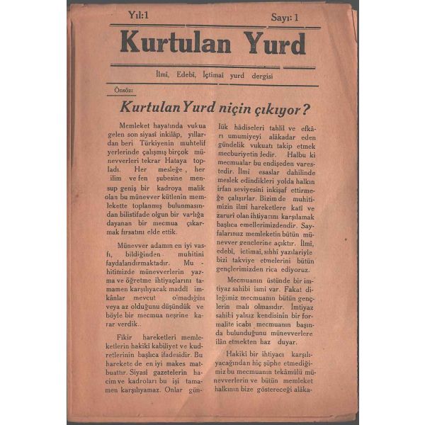 "Önsöz: Kurtulan Yurd niçin çıkıyor? Memleket hayatında vukua gelen son siyasî inkilâp, yıllardan beri Türkiyenin muhtelif yerlerinde çalışmış birçok münevverleri tekrar Hataya topladı. Her mesleğe, her ilim ve fen şubesine mensup geniş bir kadroya malik olan bu münevver kütlenin memlekette toplanmış bulunmasından bilistifade olgun bir varlığa dayanan bir mecmua çıkarmak fırsatını elde ettik. (...) Şiramız doğru, inanlı ve hakikî bir kemalist olmak ve Kemalizmin ideolojisini neşir ve tamim etmektir. Meslekimiz: Milliyetçilik, inkilâpçılık, devletçilik, lâyiklik, cumhuriyetçilik, halkçılıktır. Yalnız bizi bu çerçevenin siyasî cebhesinde değil ilmî ve ictimaî hududları dahilinde görmek istiyoruz. Siyasetle uğraşmak meslekimizin haricindedir."