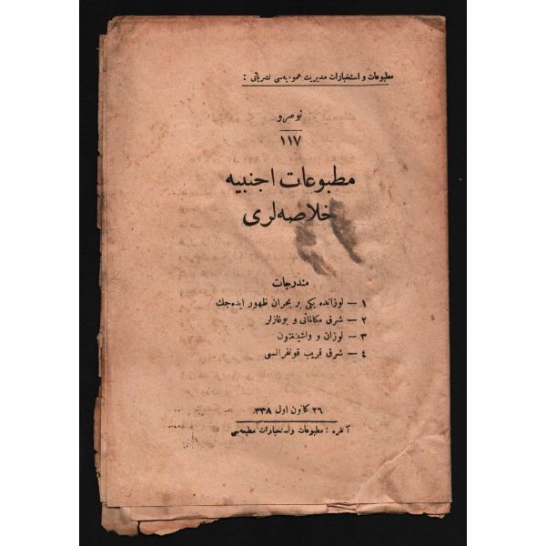 İçindeki yazılar: Lozan´da Yeni Bir Buhran Zuhur Edecek, Şarka Mükellamatı ve Boğazlar, Lozan ve Washington, Şark-ı Karib Konferansı... *Formaları ayrılmamıştır ve sayfa kenarları yıpranmıştır.