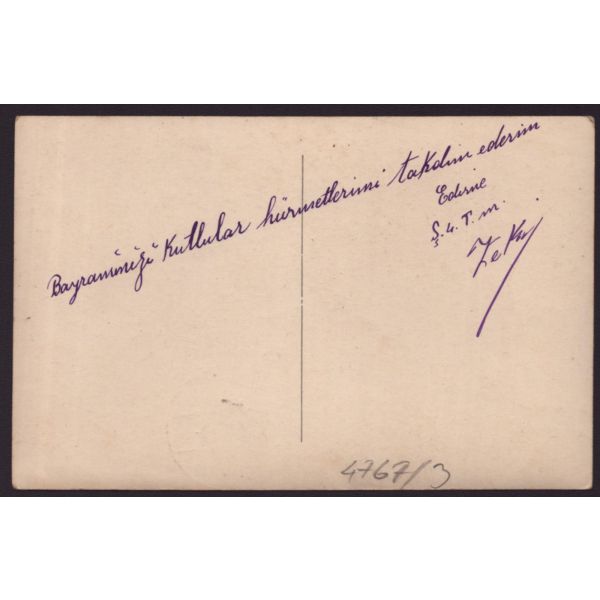 Fotokart´ın arka yüzünde, "Edirne manzarası ve Sultan Selim camii şerifi dört minareli olan Türkiye´nin en meşhur camii. 1925´te Eylül 25´inde Edirne´de bulunduğum zaman" yazılıdır.