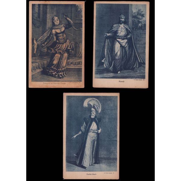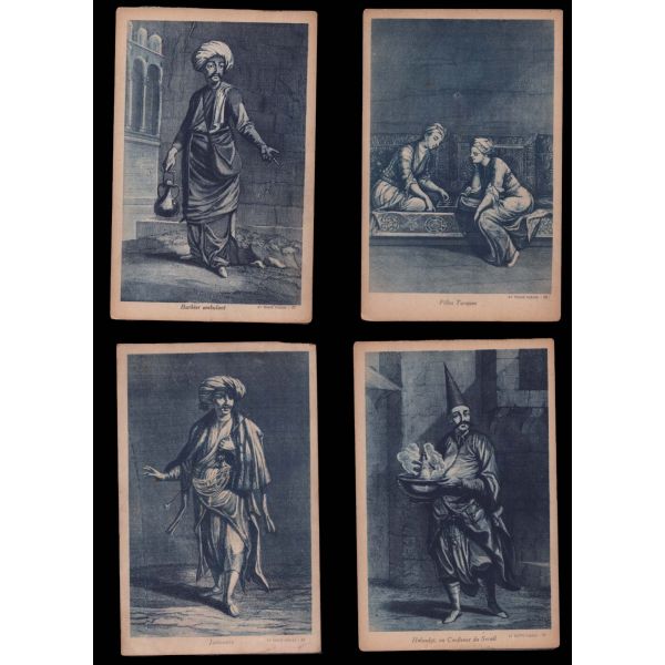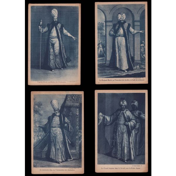 Kartpostallarda yer alan şahıslar: Solakbaşı, Kapıcıbaşı, Bostancıbaşı, Yeniçeri ağası, Kızlar ağası, yeniçeri, seyyar berber, cariyeler, çengi, helvacı.