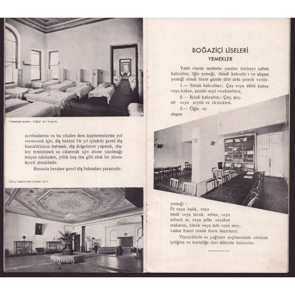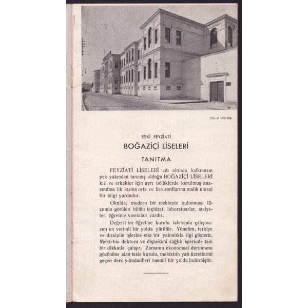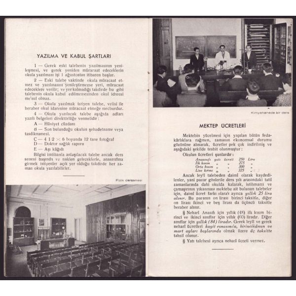 Broşür, okul tarihçesi, kayıt ücretleri, kayıt için gerekli levazımatın listelendiği metni ve okuldan fotoğrafları içerir.