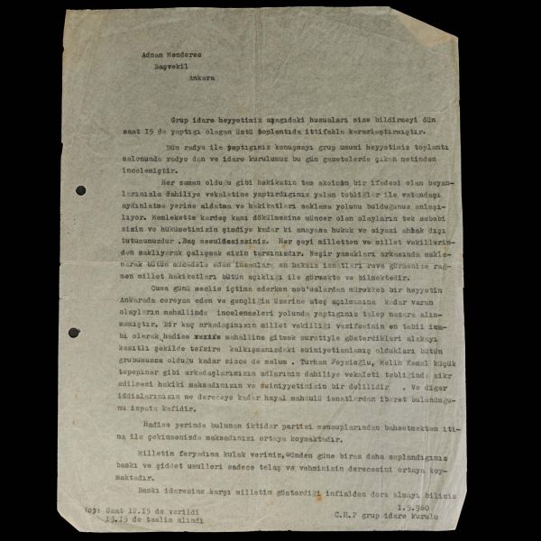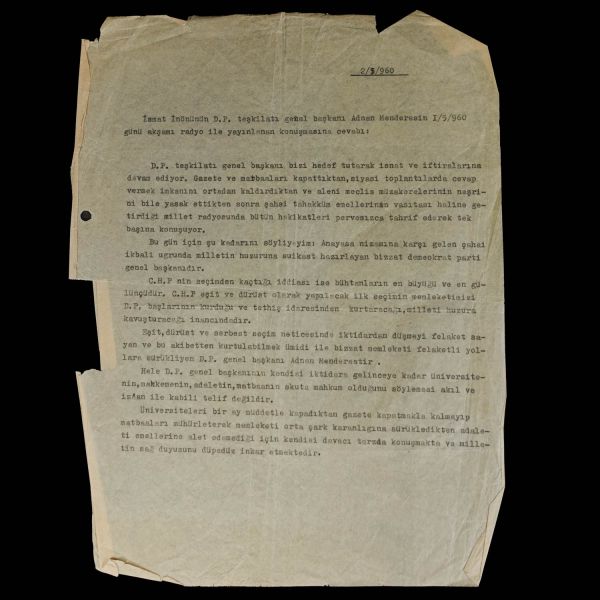 İsmet İnönü´nün cevabından alıntılar: "Bugün için şu kadarını söyleyeyim: Anayasa nizamına karşı gelen şahai ikbali uğrunda milletin huzuruna suikast hazırlayan bizzat Demokrat Parti genel başkanıdır... Eşit, dürüst ve serbest seçim neticesinde iktidardan düşmeyi felaket sayan ve bu akıbetten kurtulabilmek ümidi ile bizzat memleketi felaketli yollara sürükleyen D.P. genel başkanı Adnan Menderes´tir." CHP Grup İdare Kurulu´nun cevabından alıntılar: "Her zaman olduğu gibi hakikatın tam aksinân bir ifadesi olan beyanlarınızla dahiliye vekaletine yaptırdığınız yalan tebliğler ile vatandaşı aydınlatma yerine aldatma ve hakikatleri saklama yolunu bulduğunuz anlaşılıyor... Milletin feryadına kulak veriniz, günden güne biraz daha saplandığınız baskı ve şiddet usulleri sadece telaş ve vehminizin derecesini ortaya koymaktadır. Baskı idaresine karşı milletin gösterdiği infialden ders almayı biliniz."