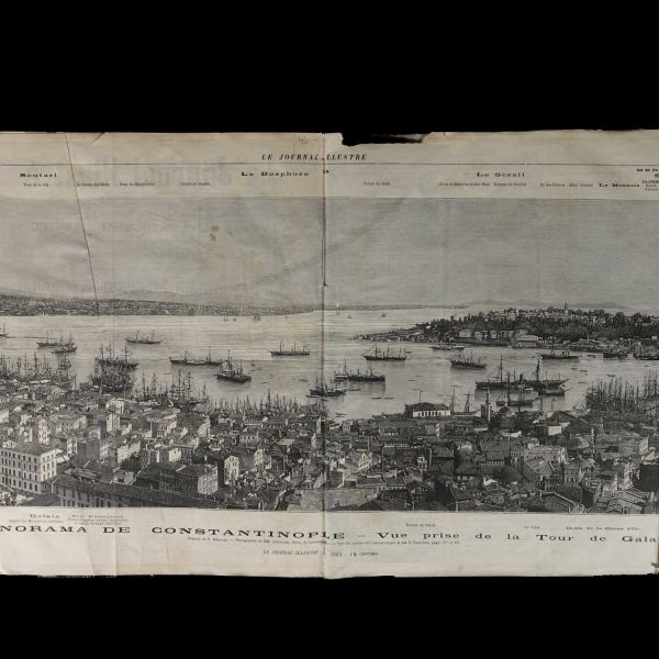 Fotoğrafta görülen ve isimleri Fransızca not düşülen yapılar (soldan sağa): Beyazıt Camii, Kapalıçarşı, Beyazıt Yangın Kulesi, Seraskerat, Süleymaniye Camii ve Mahallesi, Şeyhülislam Kapısı, Şehzade Camii...