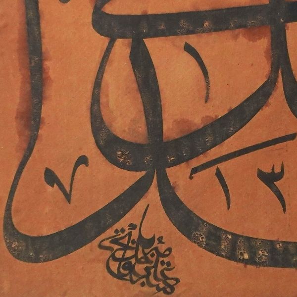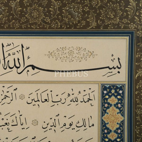 Celi sülüs karalmalar içinde sol üst tarafta nesih yazı ile yazılmış tam bir Fatiha Suresi bulunmaktadır. Sol alt tarafında Hilye-i Şerife´nin başlangıç metni olan "Hz. Ali, Rasulullah´ın vasıfları hakkında buyurdu ki..." cümlesi yazılıdır. Celi sülüs karalamalarda ayet-i kerimeler yazmaktadır.