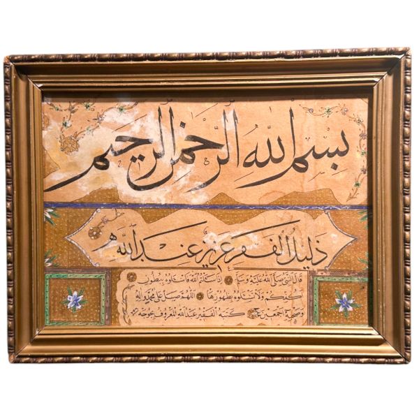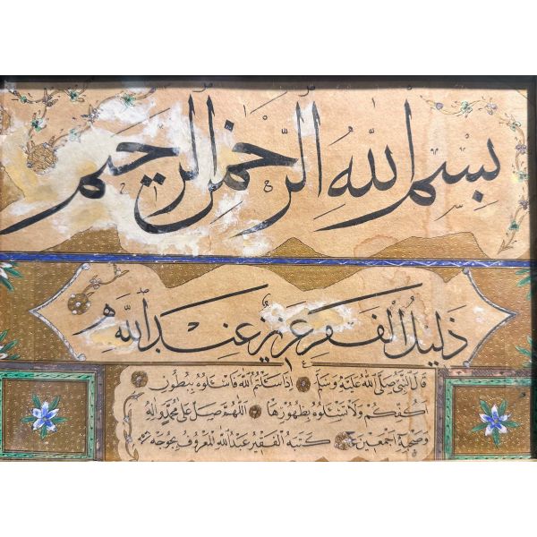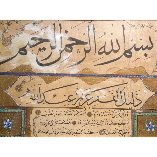 Besmele muhakkak, hadis-i şerif nesih, "tercümesi" ibaresi talik ve Türkçe tercümesi rika ile yazılmıştır.