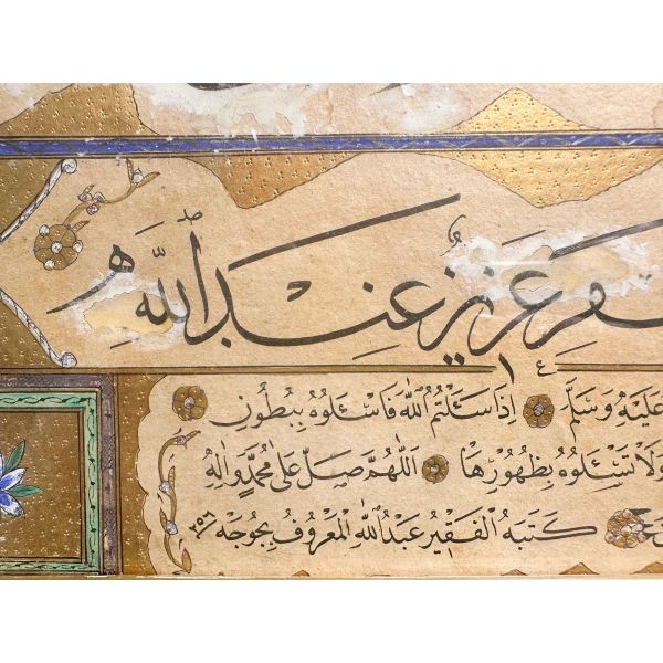 Salavat-ı şerifeler yazılıdır: "Allah´ım ruhlar içinde Muhammed (a.s)´ın ruhuna, cesetler içinde Muhammed (a.s)´ın cesedine, kabirler içinde Muhammed (a.s)´ın kabrine salât et. Güneş´in ve Ay´ın üzerine doğduğu şeyler adedince ona salât et." Eserin pervaz ebrusunun Necmeddin Okyay veya Mustafa Düzgünman'a ait olduğu düşünülmektedir.