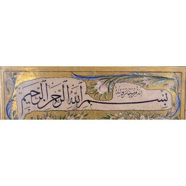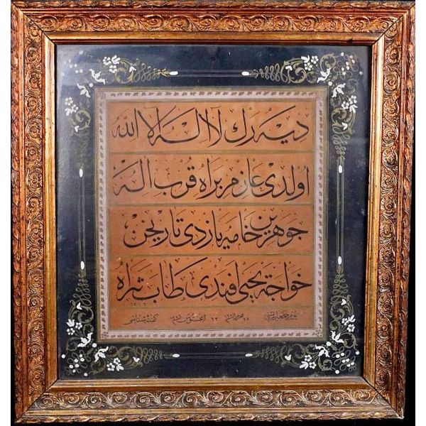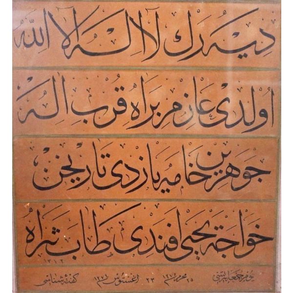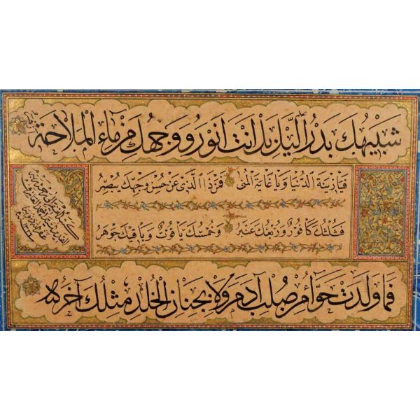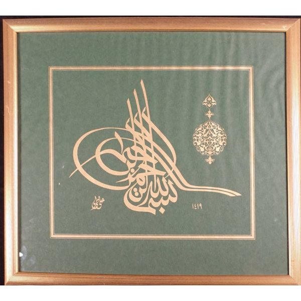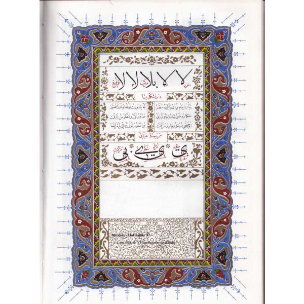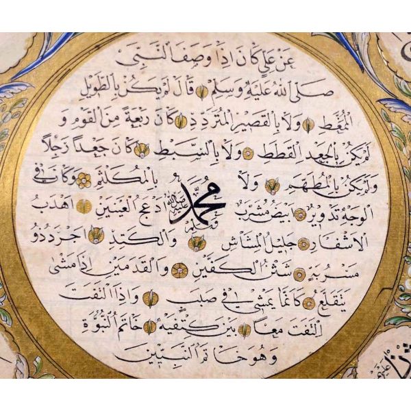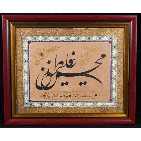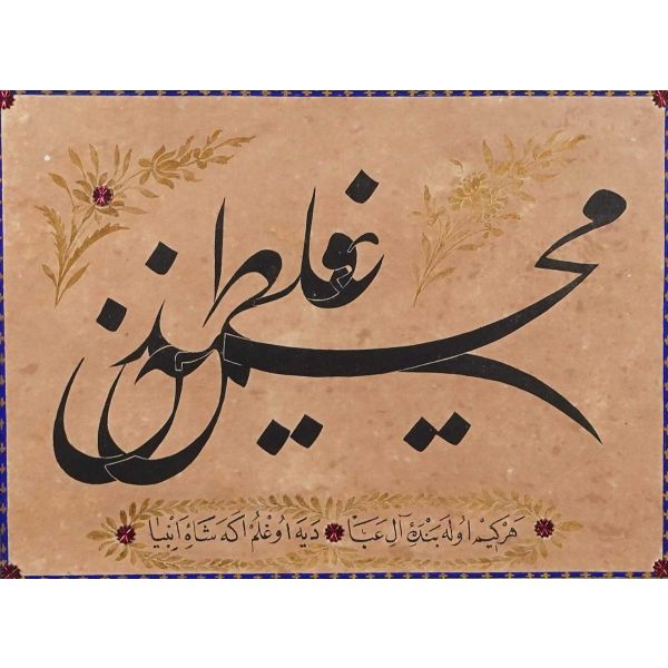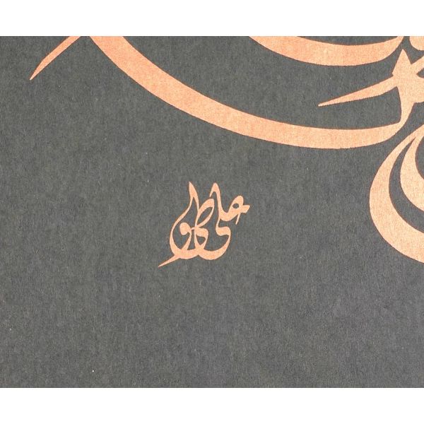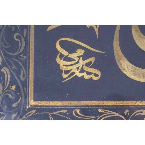 Muhammed, Fatma, Ali, Hasan, Hüseyin tetabuklu olarak tasarlanmıştır. Altında nesih yazıyla yazılmış şu beyit yer almaktadır: "Her kim ola bende-i âli âbâ / Diye oğlum âna şah-ı enbiya."