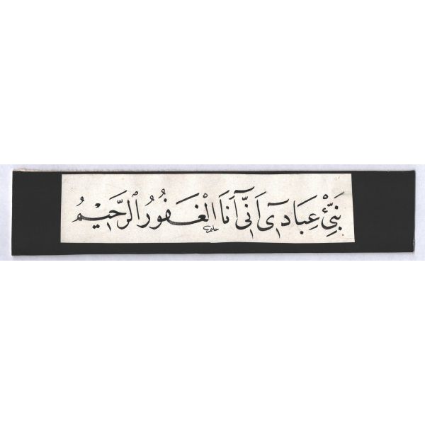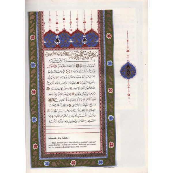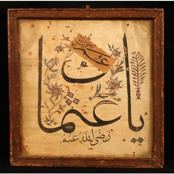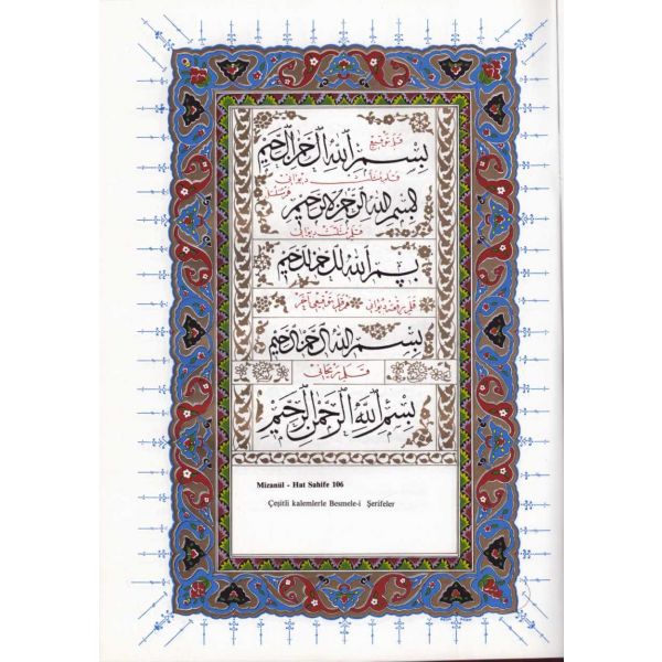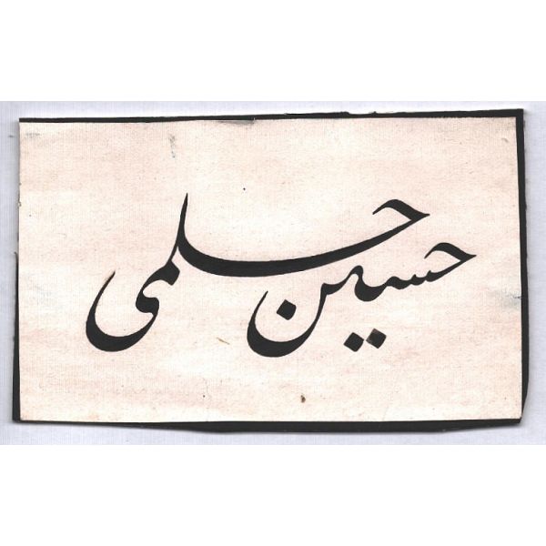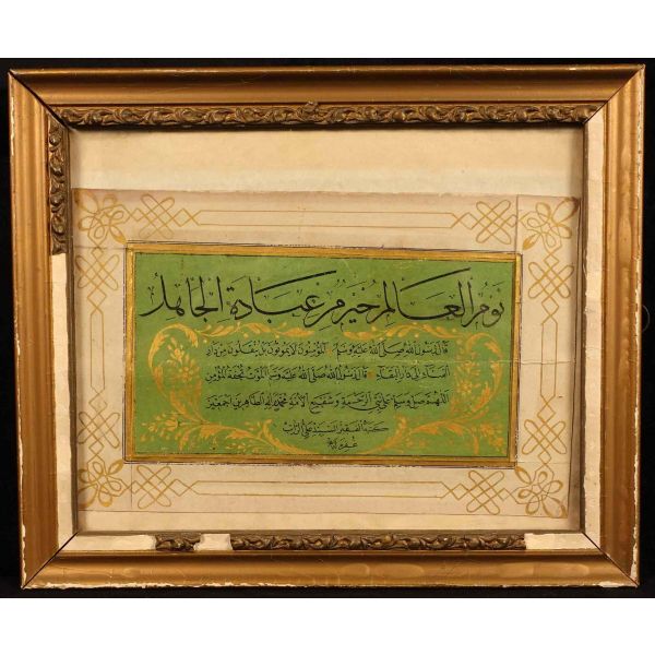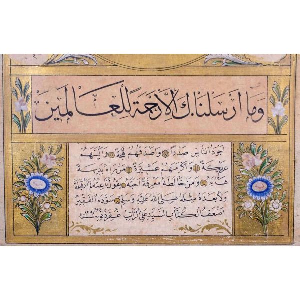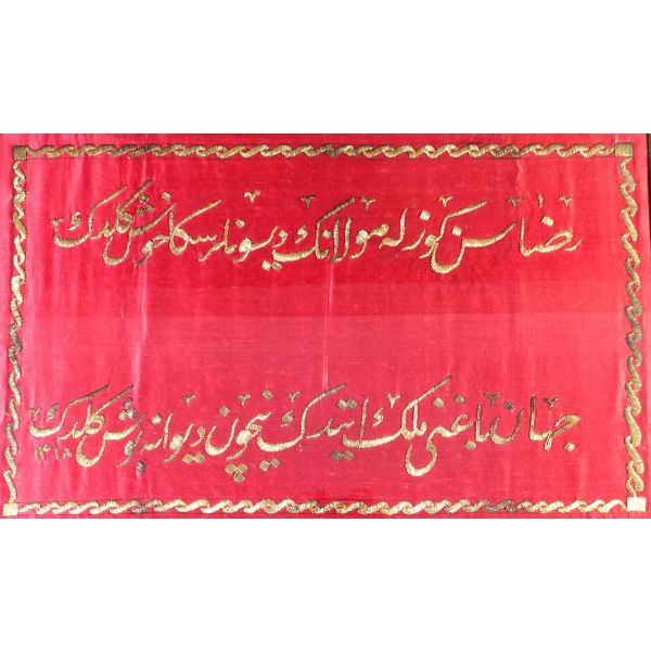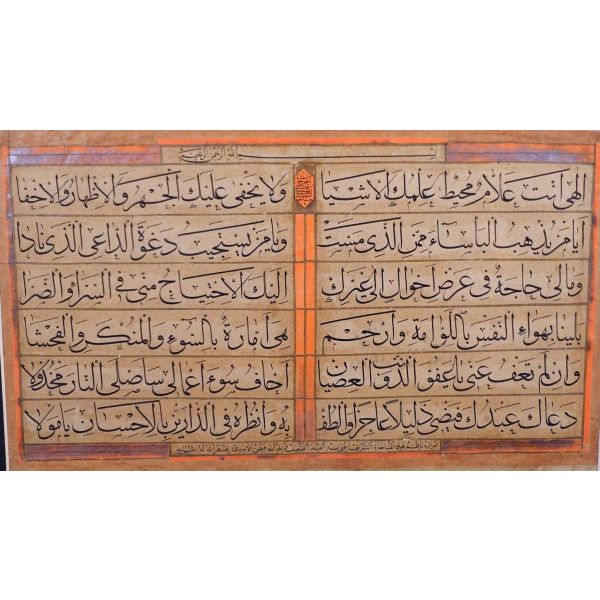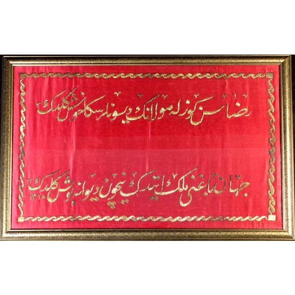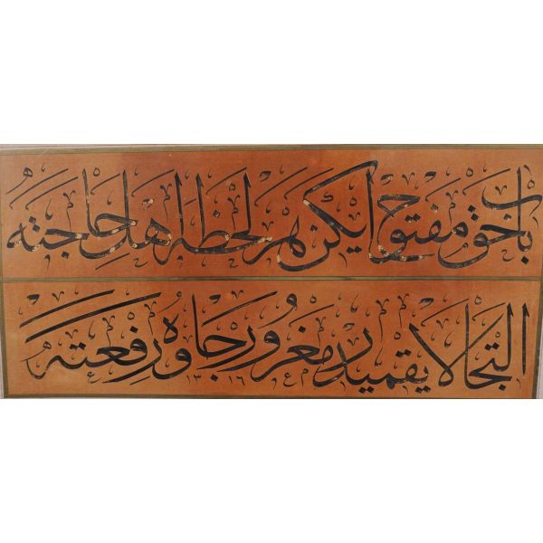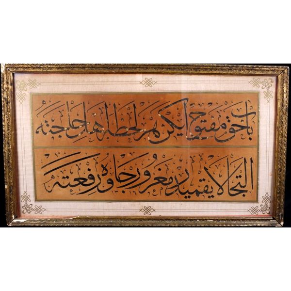 Muhammed, Fatma, Ali, Hasan, Hüseyin tetabuklu olarak tasarlanmıştır. Altında nesih yazıyla yazılmış şu beyit yer almaktadır: "Her kim ola bende-i âli âbâ / Diye oğlum âna şah-ı enbiya."