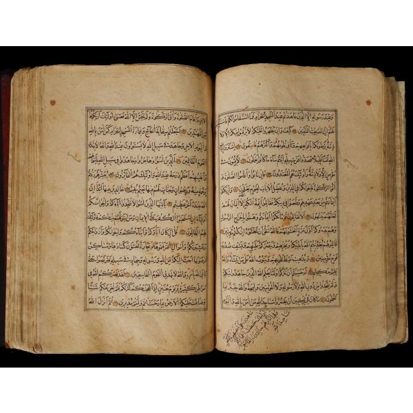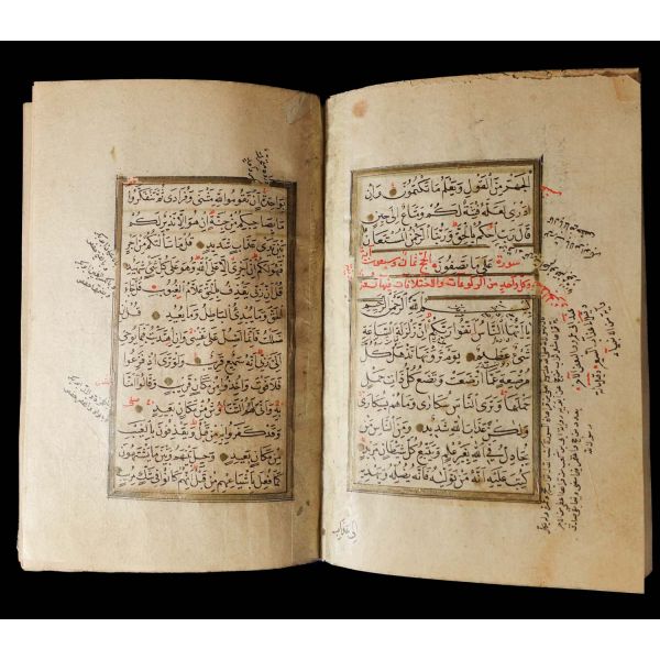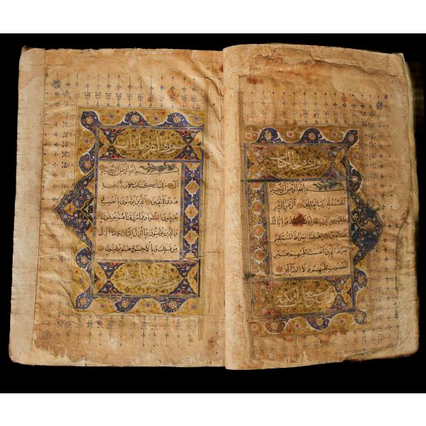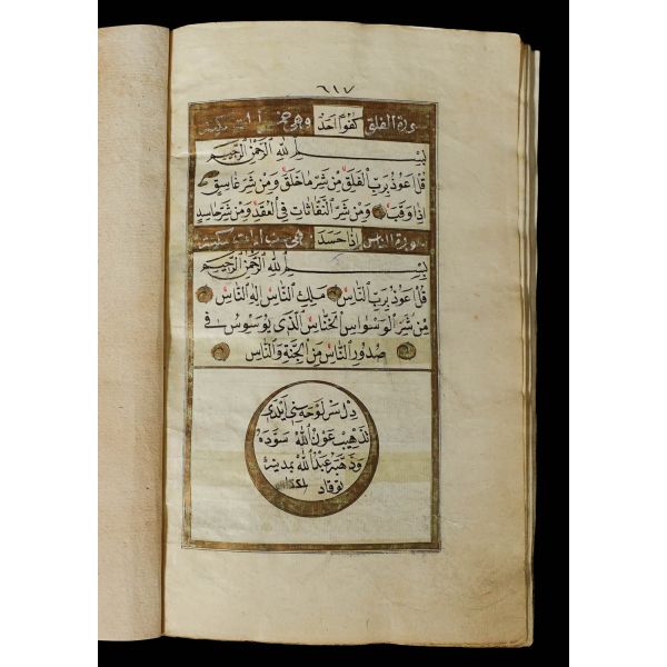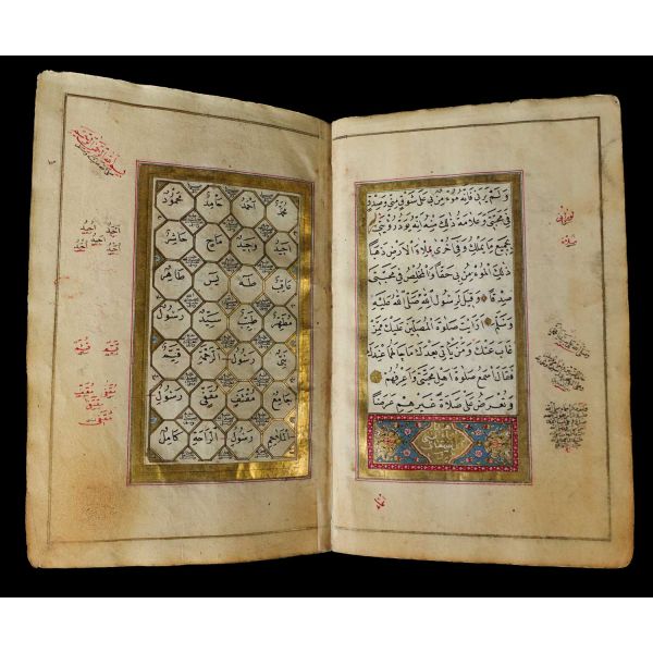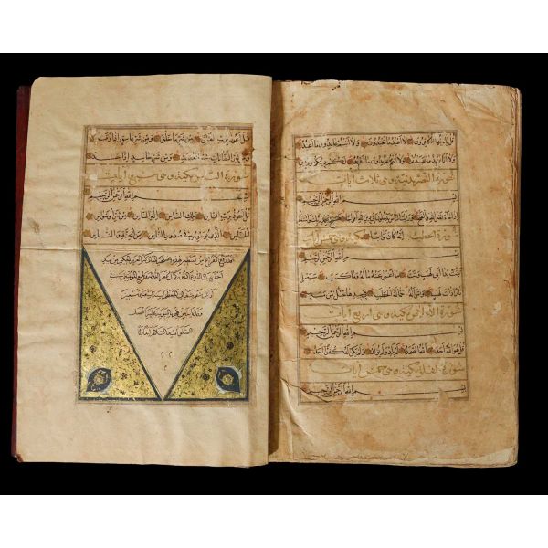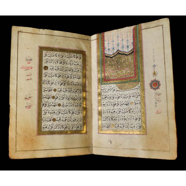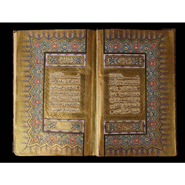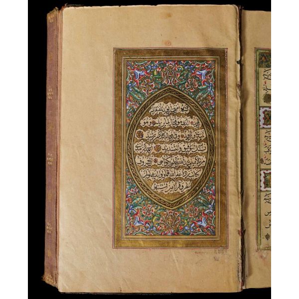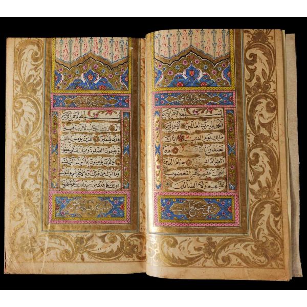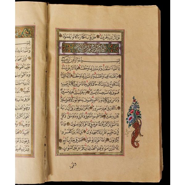 Serlevhalı, sure başları altın ile yazılı, tüm sayfaları tahrirli altın cetvelli, nesih yazının ibtidai bir hali ile kaleme alınmış, deri dönem cildinde.