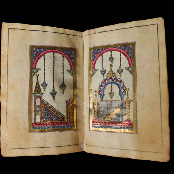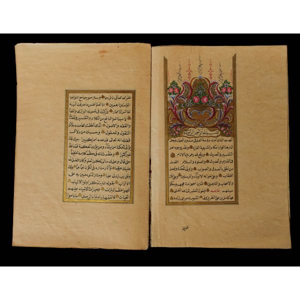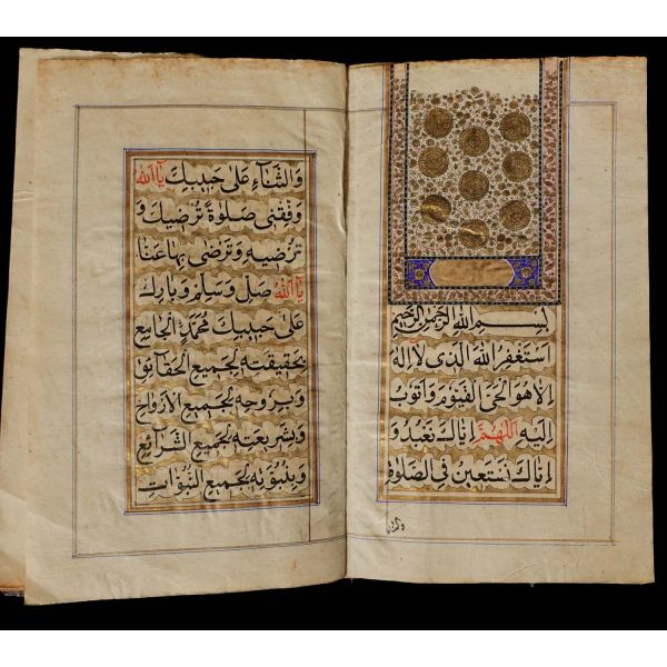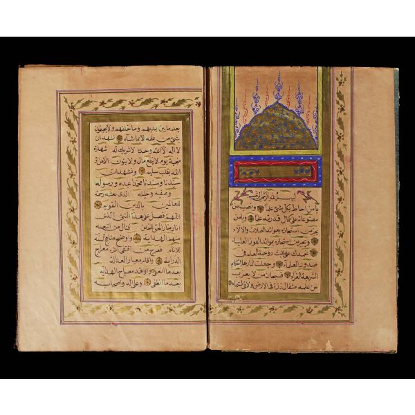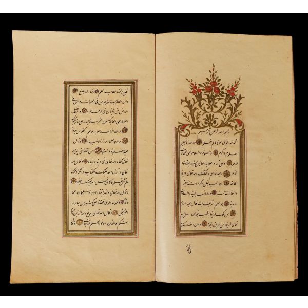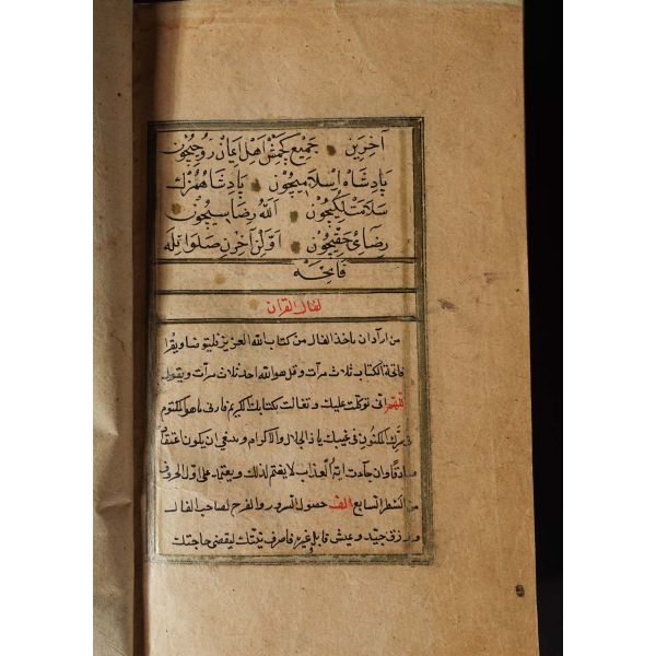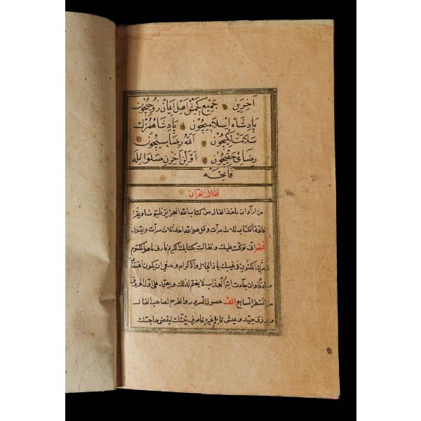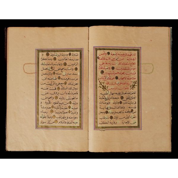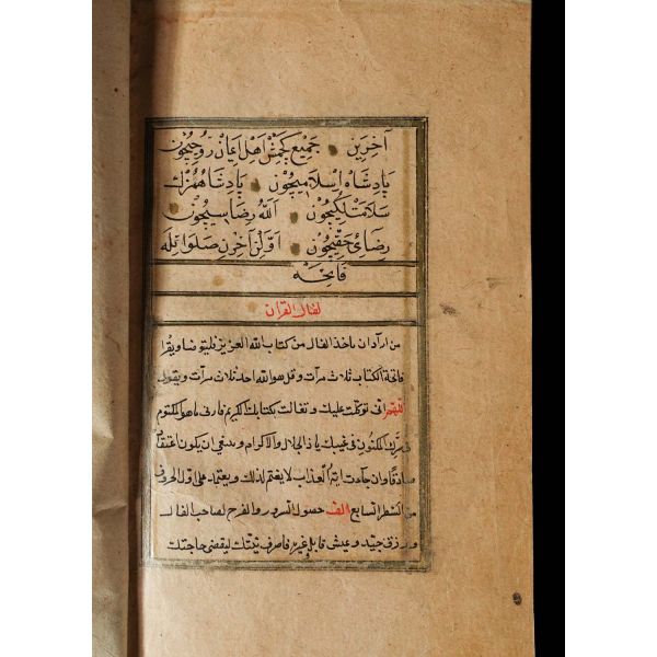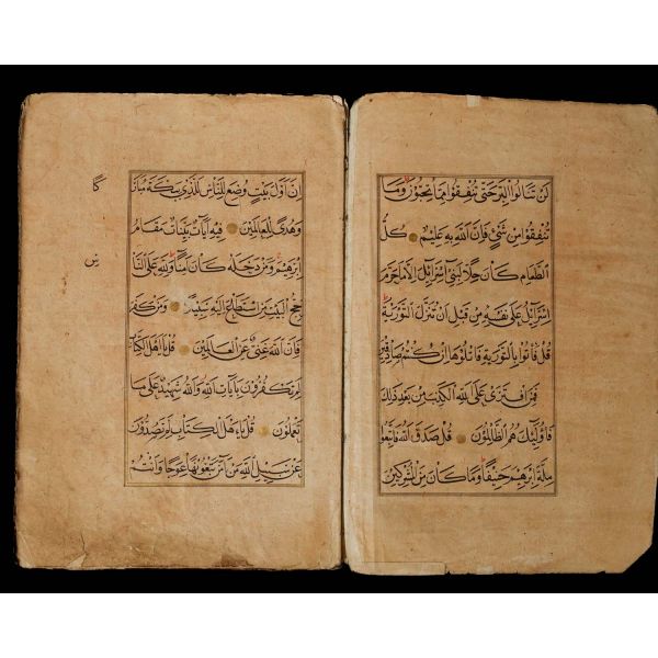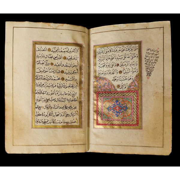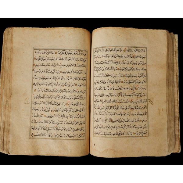 Serlevhalı, sure başları altın ile yazılı, tüm sayfaları tahrirli altın cetvelli, nesih yazının ibtidai bir hali ile kaleme alınmış, deri dönem cildinde.