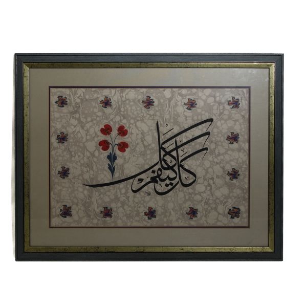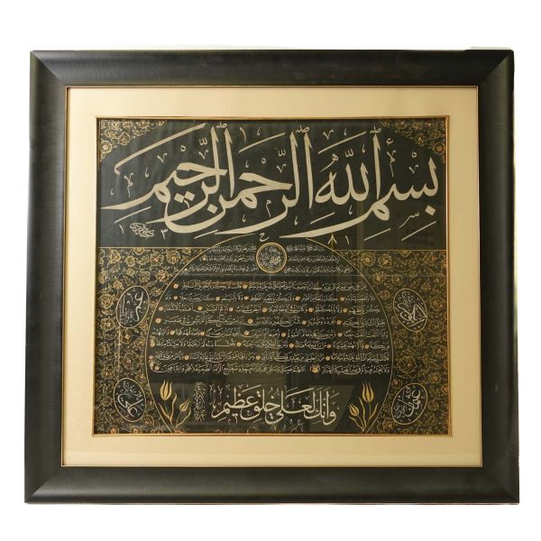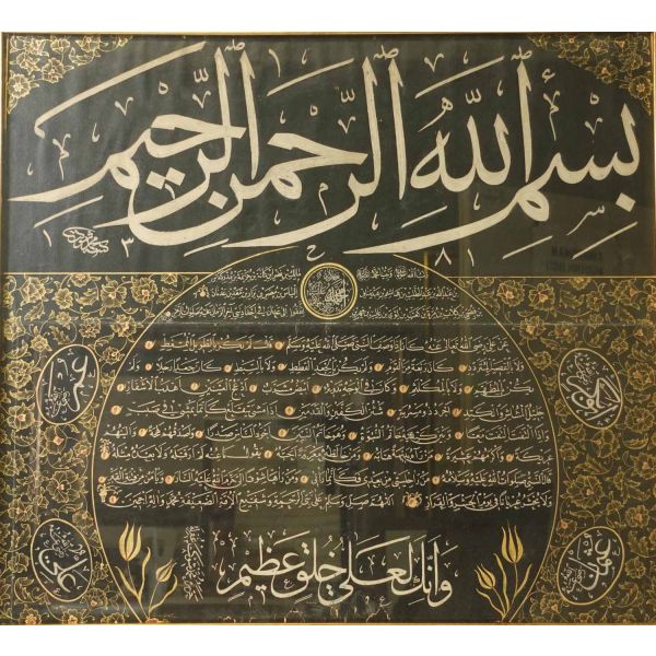 Üstte muhakkak besmele, altta nesih yazıyla yazılmış gövde metni, etrafında sülüs esma-i çehar yâr-i güzin yazılıdır. Besmelenin altındaki dairenin içinde ince sülüs yazı ile "Allah c.c. Muhammed s.a.v. Hasan r.a. Hüseyin r.a." isimleri yazılıdır. Mehmed Şevket Bey, hem besmelenin altına imza atmış hem de eserin sonuna ketebe kaydı düşmüştür.