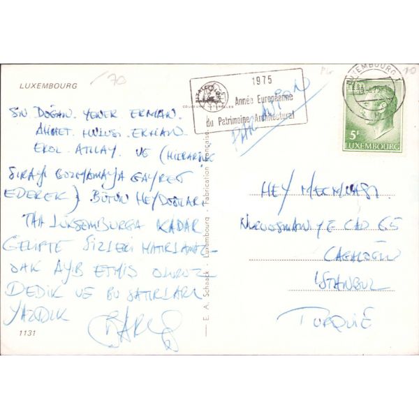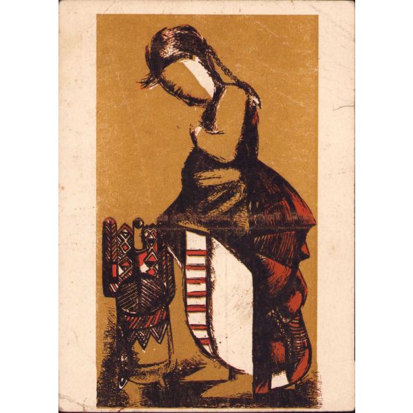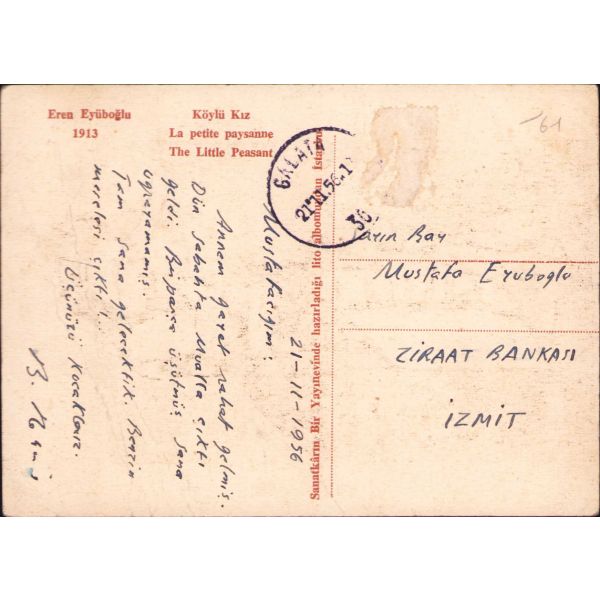 Eren Eyüboğlu'nun "Köylü Kız" tablosundan oluşturulmuş kartpostalın arka yüzüne Bedri Rahmi tarafından "Mustafacığım, annem gayet rahat gelmiş. Dün sabahta Mualla çıktı geldi. Bir parça üşütmüş sonra uyanamamış. Tam sana gelecektik. Benzin meselesi çıktı. Üçünüzü kucaklarız B. Rahmi" şeklinde not düşülmüştür.