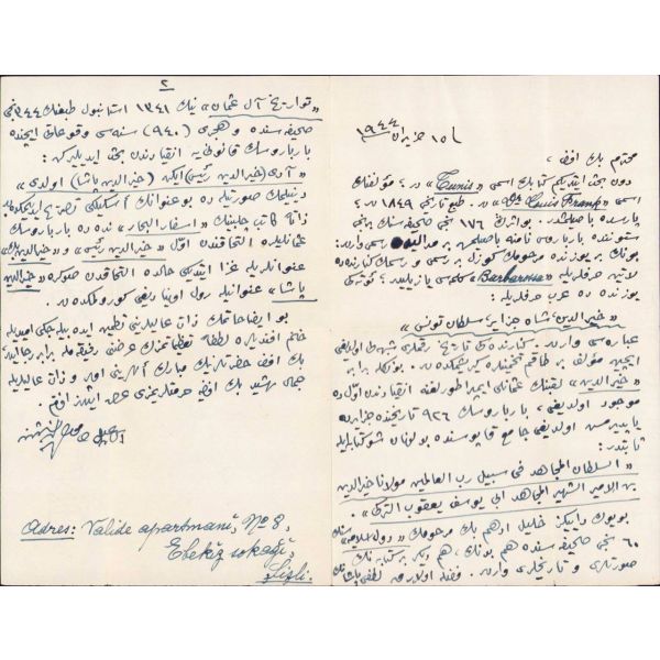 15 Haziran 1944, Muhterem Beyefendi, Dün bahsettiğim kitabın ismi "Cunis?"dir; müellifinin ismi "Dr. Louis Frank"dır. Tab' tarihi 1849'dur; Paris'de basılmışdır. Bu eserin 176'ncı sahifesinin birinci sütununda Barbaros namına basılmış bir madalya resmi vardır: bunun bir yüzünde merhumun güzel bir resmi ve resmin kenarında da Latin harfleriyle "Barbarossa" kelimesi yazılıdır; öteki yüzünde de Arab harfleriyle: