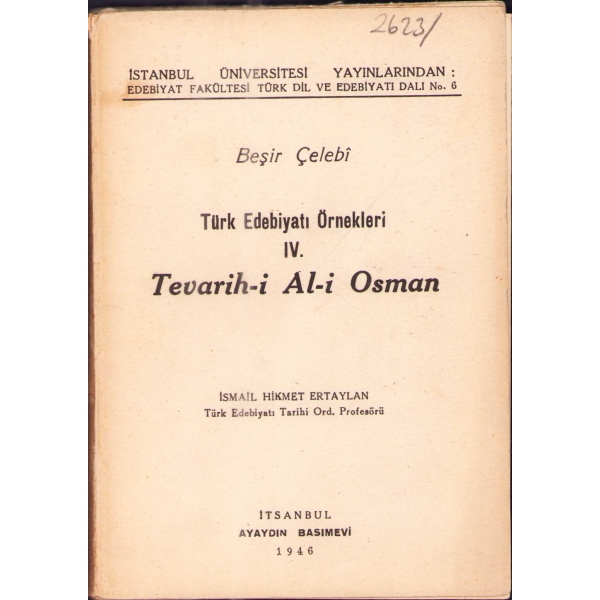 15. yüzyılda yaşamış ve önceleri Karamanoğlu Mehmet Bey'in, sonra da Fatih Sultan Mehmet'in yakınında bulunmuş olan ancak hayatı hakkında fazla bir bilgiye sahip olmadığımız Beşir Çeleb'nin "Tevarih-i Al-i Osman" adlı yazma eserinin Prof. Dr. İsmail Hikmet Ertaylan'ın (1889 - 1967) bir önsözle yayımladığı tıpkı basımı... İsmail Hikmet Ertaylandan; Cahit Külebi, Kemal Özer, Cengiz Bektaş, Edip Cansever, Arif Damar gibi nice şair ve yazarın edebiyat öğretmeni Salim Rıza Kırkpınar'a imzalı...