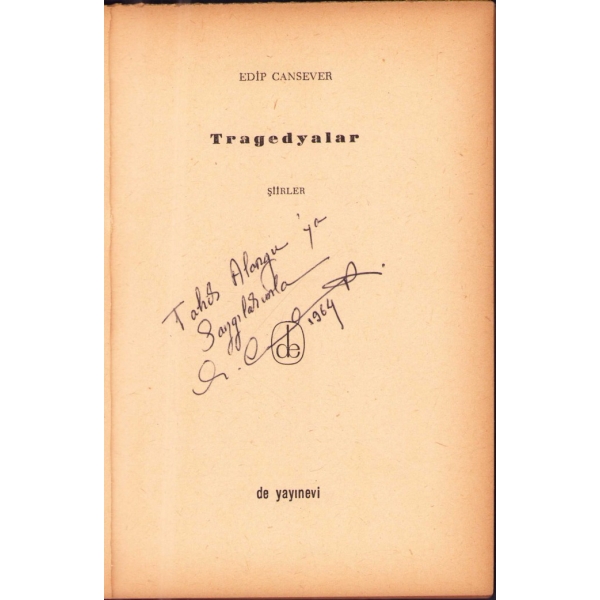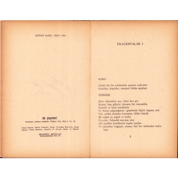 Fazıl Hüsnü Dağlarca'nın ilk kitabının ikinci basımı… "Şişli Belediye Başkanlığı Necmiye Öğretmen Kitaplığı" kaşeli… Muhtemelen şair Behçet Kemal Çağlar tarafından hediye edildiği için ön kapak içinde Behçet Kemal Çağlar'ın imzası var. Sırtında etiket var.