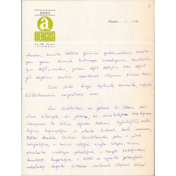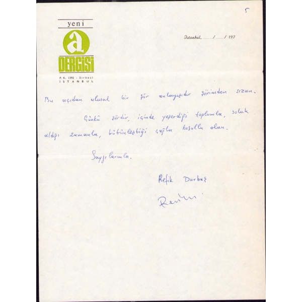 1970 Kuşağı şairlerinden Refik Durbaş'ın (1944 - 2018), Sanat Sevenler Derneği'nin "Geçen Ayın Şiirleri" programında yaptığı konuşmanın metni… "... Geri bıraktırılmış, az gelişmiş bir ülkenin şairi olma bilinciyle bir görevi, bir sorumluluğu taşıdığıma inanıyorum. Bu bilinç ışığında halkımın özgürlüğünü, mutluluğunu, bağımsızlığını ön planda tutarak...Şairin yazı işleri müdürlüğünü yaptığı " Yeni A" dergisinin antetli kâğıtlarına...