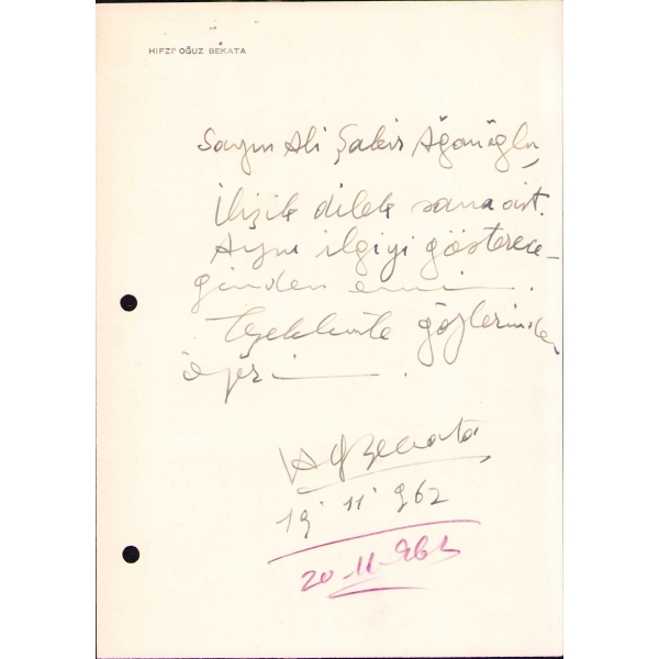 1933 – 1948 arasında 193 sayı yayımlanan Çığır dergisinin kurucusu ve başyazarı, 27 Mayıs sonrasında Kurucu Mecli Üyesi ve daha sonra da İçişleri Bakanı olan Hıfzı Oğuz Bekata'nın (1911 - 1995), yine bir siyasetçi olan Ali Şakir Ağanoğlu'na gönderdiği bir "rica" mektubu... "Aynı ilgiyi göstereceğinden eminim." Yazılı ve imzalı kartvizitiyle birlikte...
