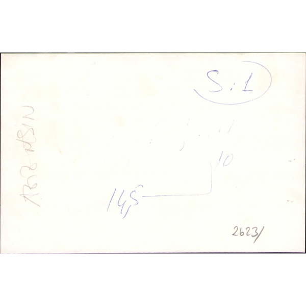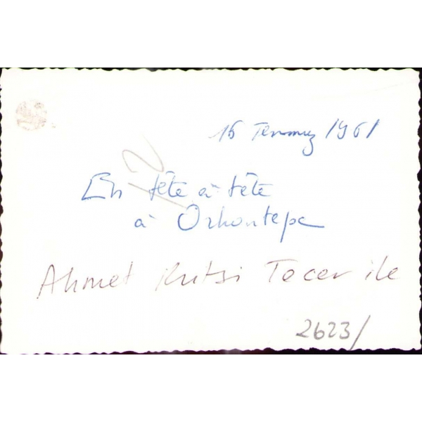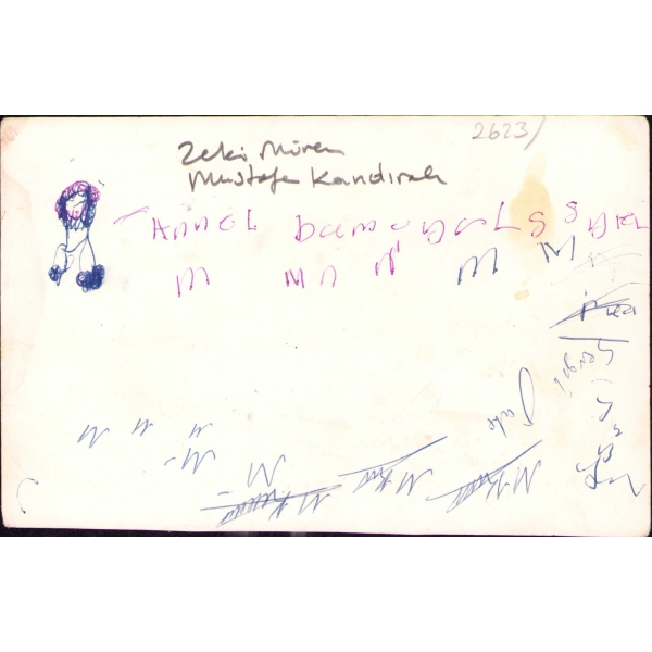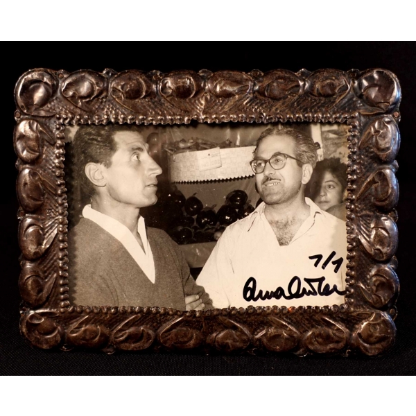 Sağlığında kendisine pek fazla bir ün ve para getirmeyen resimleri, şimdi milyonlara satılan Fikret Mualla (1903 – 1967), hiçbir akımdan etkilenmeyen, hiç kimseye benzemeyen özgün tarzıyla olduğu kadar; parasızlık, ilgisizlik ve sıkıntılarla geçen, zaman zaman yolu akıl hastanesine uğrayan çalkantılı ve bohem yaşamıyla da efsaneleşen bir ressamdı. Müzayedeye sunulan fotoğrafın arkası, ressam tarafından "Sonsuz sevgi ve saygılarımla" ibaresiyle imzalanmış. Köşeleri hafifçe kesilmiş olan fotoğraf, yılların etkisiyle biraz yorgunca…