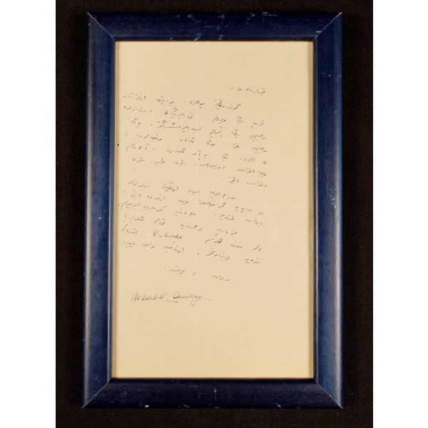 Türkçülük – Turancılık fikriyatı ve hareketinin, tartışmasız en önde gelen ismi olan Nihal Atsız'ın (1905 – 1975), "Münir" isimli bir tanıdığına yazdığı mektup… "… Tavsiyeniz üzerine Reha'nın kitabını aldım… Mükrimin Halil, eserinin hiç eksiksiz olması için zaman öldürerek eserini bitirememişti. Siz henüz gençsiniz ve Mükrimin gibi gece sefahatleriniz yok ama yine de..." Ahşap çerçeve içinde (Çerçeve boyutları: 13 X 36 cm)...