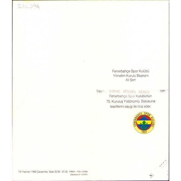Şiirleriyle olduğu kadar, denemeleri ve eleştirileriyle de İkinci Yeni'nin en önde gelen şairi olan Cemal Süreya'nın (1931 - 1990), aynı zamanda çok sıkı bir Fenerbahçe taraftarı olduğunu biliyoruz. Müzayedeye sunulan bu fevkalade parça, 16 Haziran 1982 tarihinde Hilton'da yapılacak olan, Fenerbahçe'nin 75. Kuruluş Yıldönümü Balosu için, Cemal Süreya'ya dönemin kulüp başkanı Ali Şen adına gönderilmiş bir davetiyedir. Şair, aldığı bu davetiyeyi, adeta bir lise talebesi coşkusuyla kendince tasarlayarak sarı - lacivert renklere boyamış ve imzalamıştır.