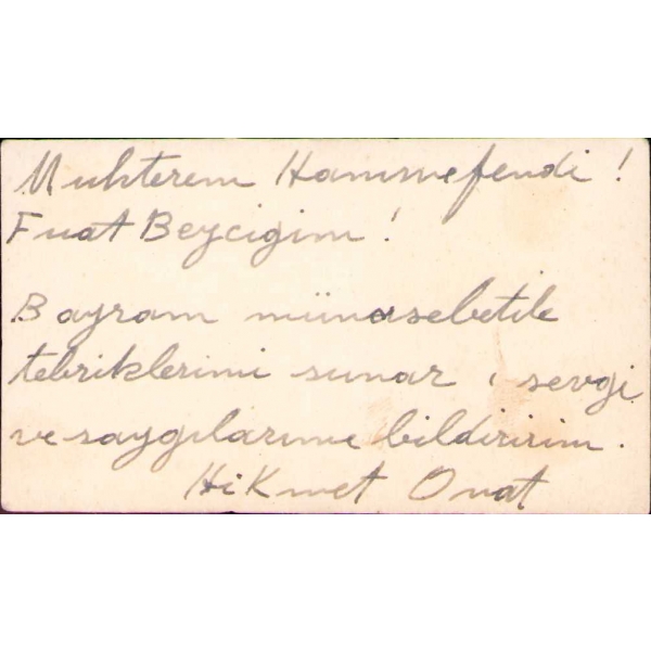 Empresyonist resmin Türkiye'deki en büyük temsilcisi ve resim sanatımızın en büyük ustalarından Hikmet Onat'ın (1882 - 1977) "Muhterem Hanımefendi, Fuat Beyciğim" hitabıyla yazdığı bir bayram tebriği…