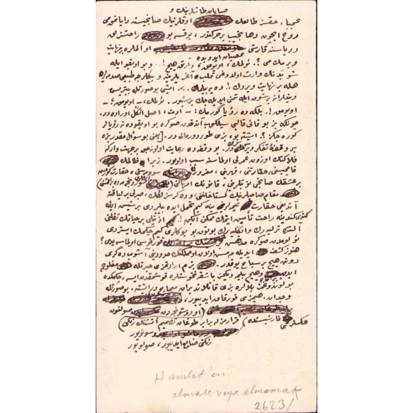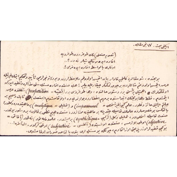 Aslında Mekteb-i Tıbbiye mezunu olmasına ve felsefe eğitimi almamış olmasına karşın, felsefeye ilgisi nedeniyle “Feylesof Rıza” olarak tanınan ve felsefeci, siyasetçi ve şair kimliğiyle son dönem Osmanlı aydınlarının en ilginç simalarından biri olan Rıza Tevfik'in (1869 – 1949) terekesinden çıkmış; muhtemelen konferansları ya da dersleri için aldığı notlar... "İkinci Bahis, 17. Makale. Tasvir sanatının doğrudan doğruya ifade edemediği şeyler nedir?..."