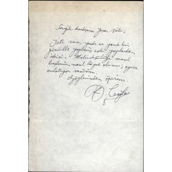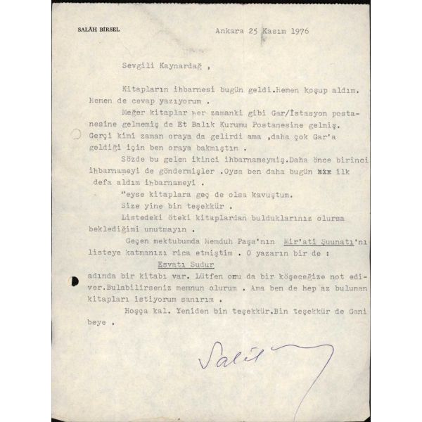 Türk ve dünya edebiyatının zengin ayrıntılarıyla işlediği denemeleriyle "edebiyatın karakutusu" unvanını sonuna kada hak eden şair ve yazar Salah Birsel´in (1919 - 1999), inanılmaz ölçüde geniş birikiminin nasıl oluştuğunu gösteren küçük bir örnek... Yazar, Sahaf Arslan Kaynardağ´a kendisine gönderdiği kitaplar için teşekkür ediyor ve yeni kitaplar sipariş ediyor.