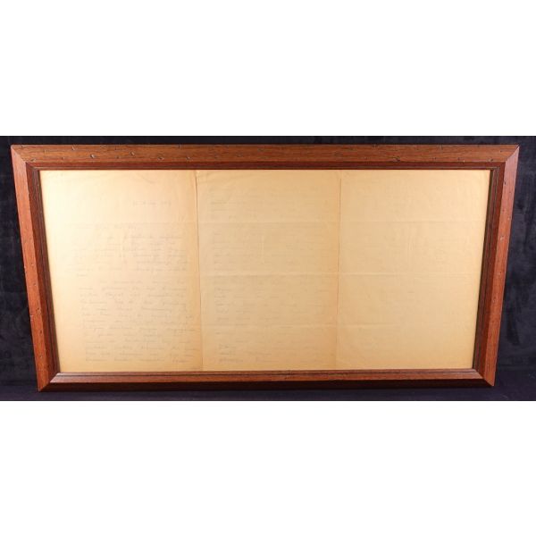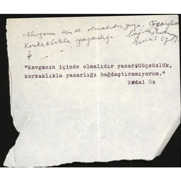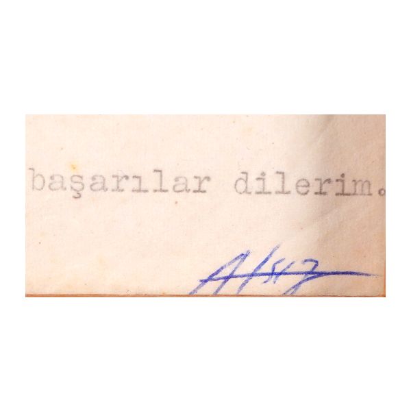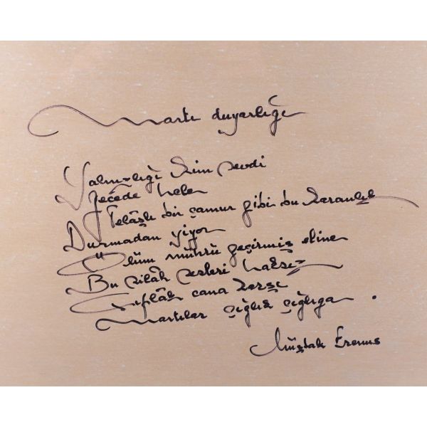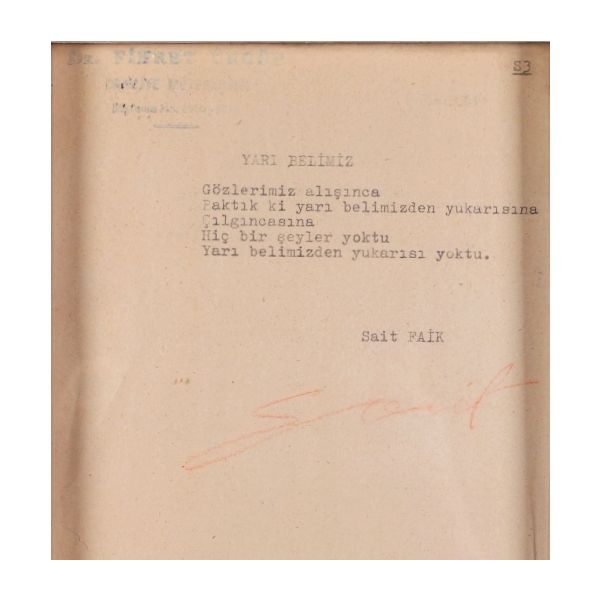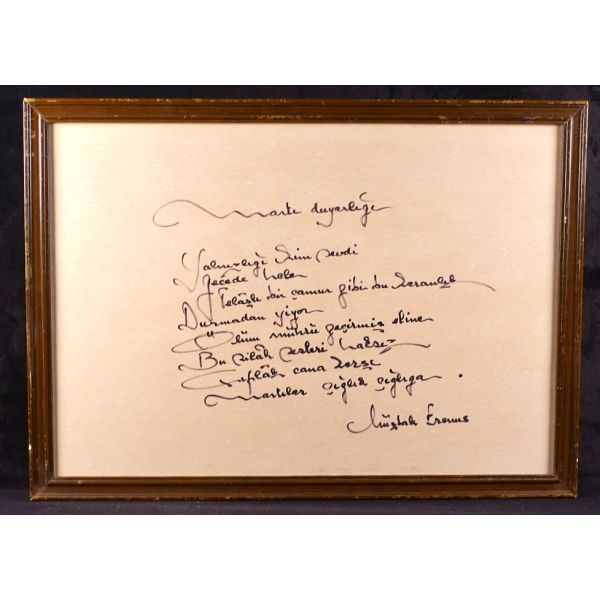 Modern hikâyeciliğimizin en önemli ismi olan Sait Faik (1906 – 1954), hikâye kadar ağırlık vermemekle birlikte, şiirlerinde de özgün tarzını hiç yitirmeden hikâyelerine benzer bir dünya yaratmış, kimilerine göre, daha fazla kendi kendisi olmuştur. Müzayedeye sunulan eser, Sait Faik´in yakın arkadaşı ve doktoru olan hikâyeci Fikret Ürgüp´ün antetli kâğıdına yazılmış. İmza, kırmızı sabit kalemle atıldığı için biraz soluk görünüyor. / Eski ahşap çerçeve içinde... (Çerçeve boyutları: 20,5 X 26,5 cm...)