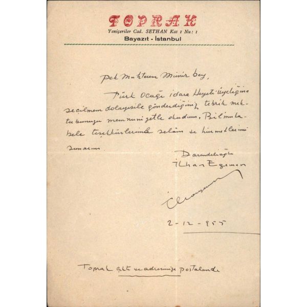 19 Kasım 1979 tarihinde bir terör saldırısı sonucunda öldürülen gazeteci, yazar İlhan Egemen Darendelioğlu´ndan, Türk Ocağı idare heyeti üyeliğine seçilmesi dolayısıyla Münir Baraz´ın tebriğine karşılık olarak gönderilmiş teşekkür mektubu… Toprak dergisi antetli kâğıda...