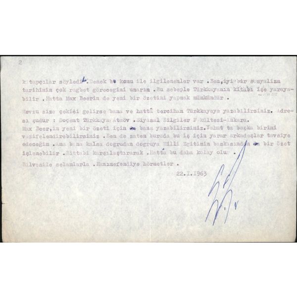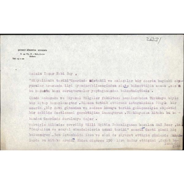 Gençliğinde Turancı, 1920 - 1927 yılları arasında TKP yöneticisi, sonrasında ise Kemalist rejimin savunucusu ve kuramcısı olan; "Enver Paşa, Tek Adam, İkinci Adam" adlı biyografik eserleriyle, "Suyu Arayan Adam" adlı otobiyografik eseriyle tanınan, yazar, tarihçi ve iktisatçı Şevket Süreyya Aydemir´in (1897 - 1976) Yaşar Nabi Nayır´a, yayımlaması için, Türkkaya Ataöv´ün "sosyalizmin tarihi" üzerine bir çalışmasını önerdiği mektubu... Kendi adıyla antetli kâğıda...