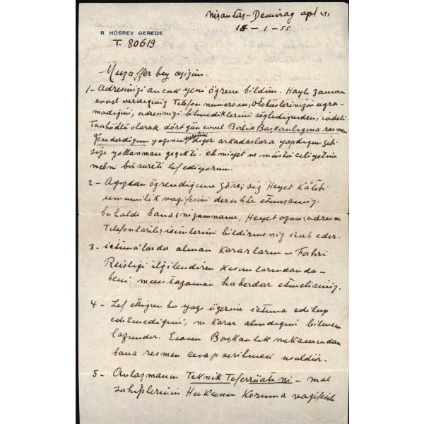 Mustafa Kemal Paşa´nın Samsun´a birlikte çıktığı arkadaşlarından, asker, diplomat ve siyasetçi Hüsrev Gerede´nin (1884 - 1962) "Yugoslavya’da Emlaki Bulunanların Haklarını Koruma Cemiyeti" fahri başkanı olduğu dönemde, cemiyetin kâtib-i umumisi olan Muzaffer Bey´e hitaben yazdığı, 15.01.1955 tarihli mektup... Kendi adıyla antetli kâğıda...