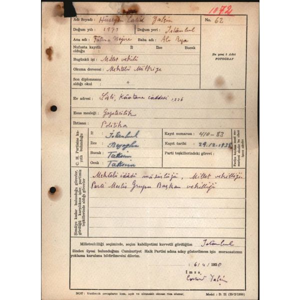 Eski Servet-i Fünuncu, İttihatçı, gazeteci ve politikacı Hüseyin Cahit Yalçın´ın 1875 - 1957), el yazısıyla doldurup imzaladığı, milletvekilliği adaylık başvuru formu… Formda "seçim kabiliyetini kuvvetli gördüğü yer" olarak İstanbul´u belirtmişse de, Demokrat Parti İstanbul´u adeta süpürdüğü için, meclise ancak Kars milletvekili olarak girebildi.