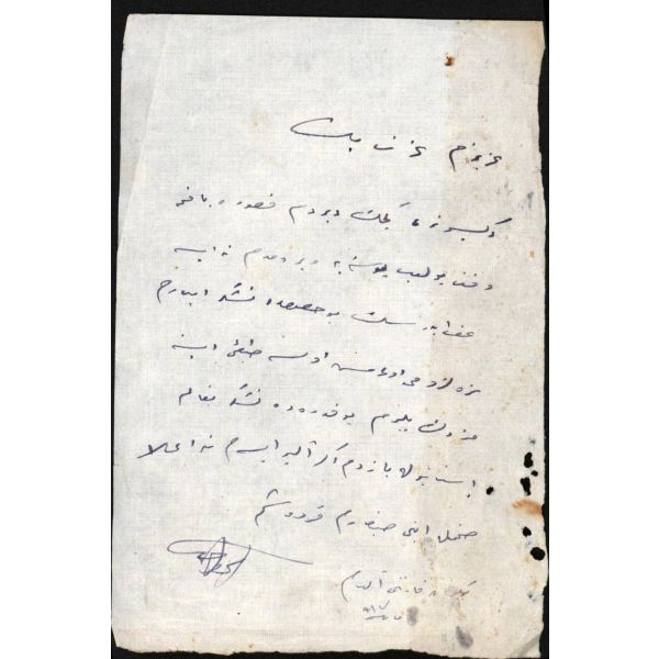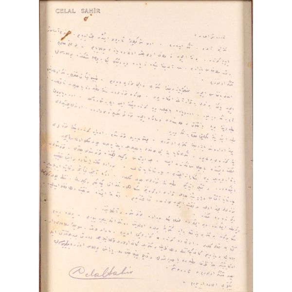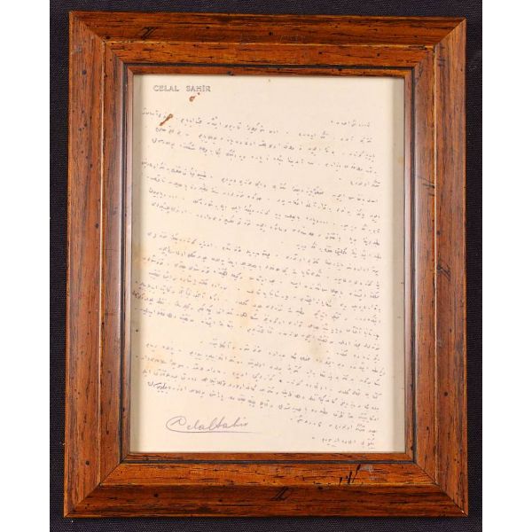 Döneminde "Aşk ve Kadın Şairi" olarak tanınan Celal Sahir’in, gazeteci Ali İhsan (Barlas)’a yazdığı mektup… /Çerçeve içinde (Çerçeve boyutları: 21 X 26,6 cm)…