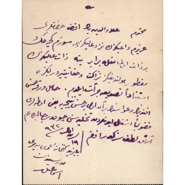 Yaklaşık 40 yıl boyunca Beyazıt Kütüphanesi müdürlüğünü yürüten, "Hâfız-ı Kütüb, Fihrist-i Ulum, Çağının Câhiz´i" gibi sıfatlarla anılan, son dönem Osmanlı alimlerinden İsmail Saib Sencer´in (1873 - 1940) "Muhterem Alaeddin Beyefendi Hazretleri" hitabıyla başlayan, "hamil-i varaka Hüsnü Efendi´nin davasının bir an evvel hüsn-i netice"sini rica eden mektubu... "Artık lütuf sizindir efendim."