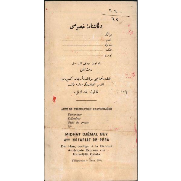 İstiklal Marşı´mızın şairi MehmeT Âkif (1873 - 1936), II. Meşrutiyet sonrasında İttihat ve Terakki´nin Şehzadebaşı İlmiye Mahfelinde Arap edebiyatı, Darülfünun’da da Edebiyat-i Osmaniye dersleri vermeye başlamıştı. Müzayedeye sunulan imtihan kâğıdı, muhtemelen bu dönemde tahsil gören bir talebeye aittir ve Âkif´in takdiri 4 (dört) puan olmuştur. Filigranlı, gofreli kâğıda...