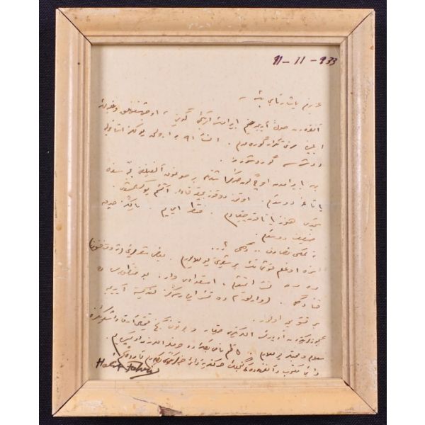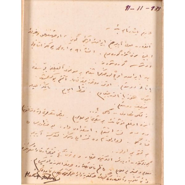 Beş Hececilerden Halit Fahri Ozansoy´un (1891 - 1971) Varlık dergisi ve Varlık yayınları sahibi Yaşar Nabi Nayır´a, 11.11.1933 tarihli mektubu… / Eski ahşap çerçeve içinde… (Çerçeve boyutları: 14,5 X 18,5 cm...)