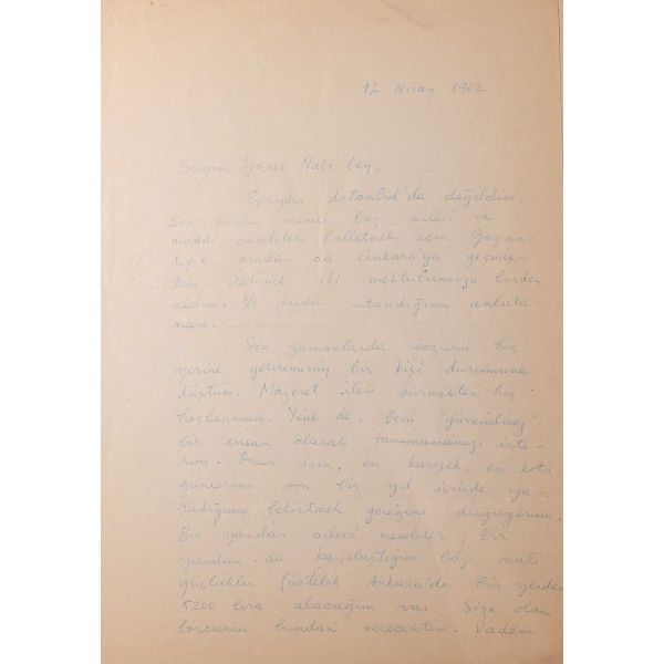 İkinci Yeni´ye sonradan katılan bir şair olmasına karşın, bu akımın önde gelen şairleri arasına giren Ülkü Tamer´den (1937 - 2018), Varlık dergisi ve Varlık Yayınları kurucusu Yaşar Nabi Nayır´a: "Sayın Yaşar Nabi Bey, Epeydir İstanbul´da değildim. Son derece önemli bazı ailevi ve maddi meseleleri halletmek için Gaziantep´e, oradan da Ankara´ya geçmiştim. Gelince iki mektubunuzu birden aldım. Ne kadar utandığımı anlatamam..." / Üç sayfa yan yana çerçeveli (Çerçeve boyutları: 70 X 38 cm)...