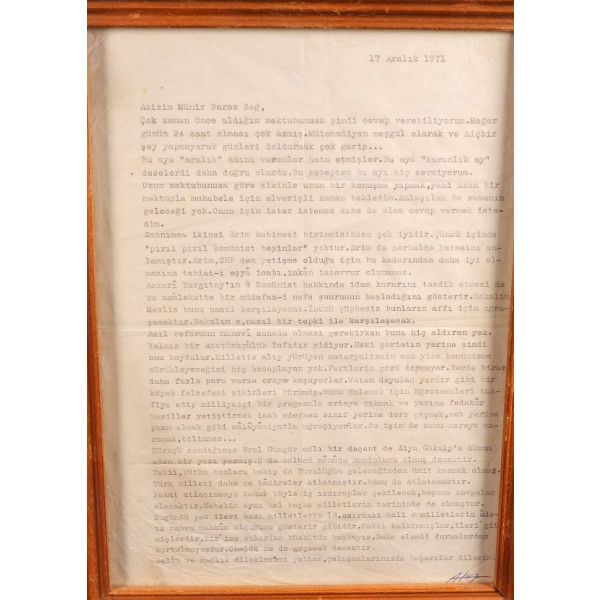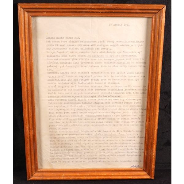 Türkçülük – Turancılık fikriyatı ve hareketinin, tartışmasız en önde gelen ismi olan Nihal Atsız´ın (1905 – 1975), 17 Aralık 1971 tarihli, ilginç bir mektubu: "… Askeri Yargıtay´ın 9 komünist hakkında idam kararını tasdik etmesi bu memlekette bir müdafaa-i nefs şuurunun başladığını gösterir. Bakalım meclis bunu nasıl karşılayacak. İnönü şüphesiz bunların affı için uğraşacaktır... Bir Atatürkçülük lafıdır gidiyor. Eski şeriatın yerine şimdi onu koydular... Türkçü sandığımız Erol Güngör adlı bir doçent de Ziya Gökalp´e hücum eden bir yazı yazmış..." / Ahşap çerçeve içinde (Çerçeve boyutları: 24,5 X 35 cm)...