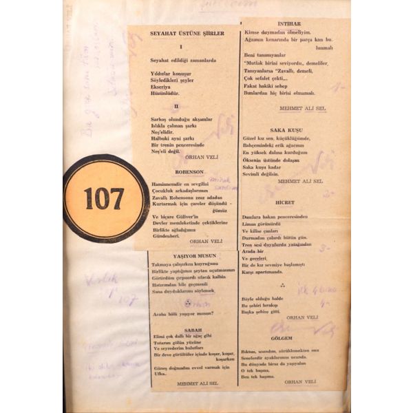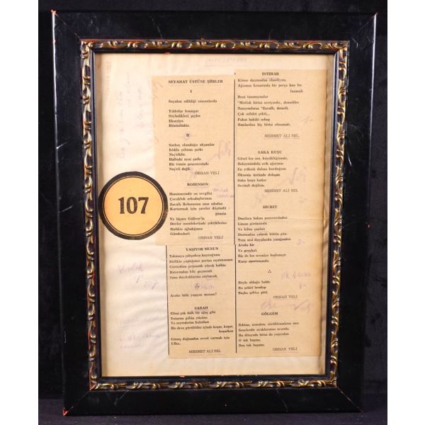 Garip Şiiri´nin de asıl kurucusu ve en önemli şairi olarak kabul edilen Orhan Veli´nin (1914 - 1950); Varlık dergisinin 107. sayısında Orhan Veli ve takma adı Mehmet Ali Sel imzasıyla yayımlanan "Seyahat Üstüne Şiirler, Robenson, Yaşıyor musun, Sabah, İntihar, Saka Kuşu, Hicret, Gölgem" şiirlerinden kendisinin yaptığı ve birtakım notlar yazarak imzalar attığı kolajdı... / Şık çerçeve içinde... (Çerçeve boyutları: 31 X 40 cm...)(SANA BU GECE TÜM SARHOŞLARIN SELAMI VAR...VARLIK SAYI 107...MONİTÖR SABRİ...ORHAN...VE BENZERİ NOTLAR ALDIĞI ÇOK NADİR 4 ADET İMZALI KOLAJ ÇALIŞMASI)