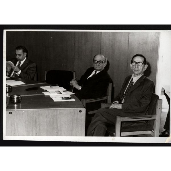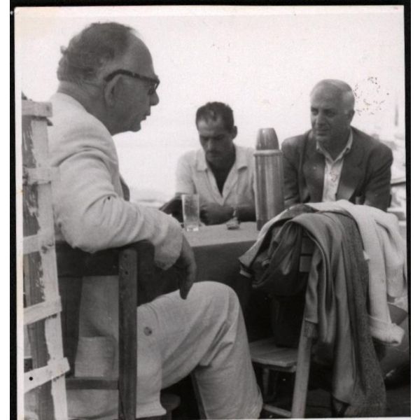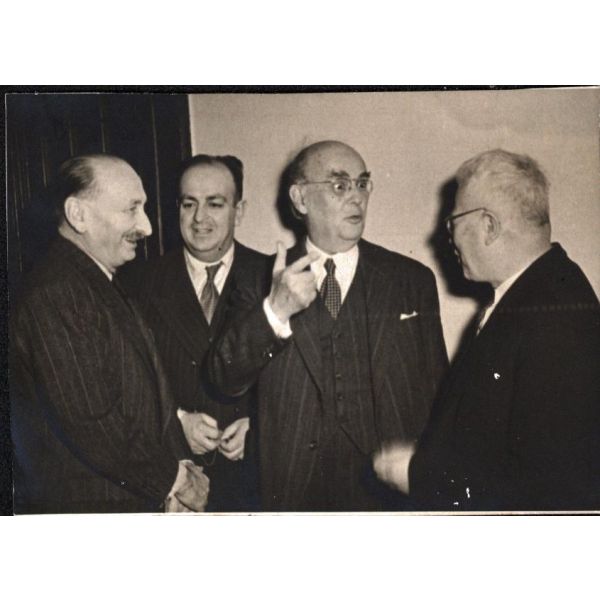 Eski Servet-i Fünuncu, İttihatçı, gazeteci ve politikacı Hüseyin Cahit Yalçın 1875 - 1957) ve politikacı - yazar Naşit Uluğ (1902 - 1977), muhtemelen mecliste, milletvekili arkadaşlarıyla sohbet ederken…