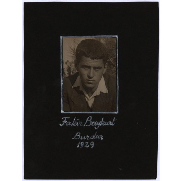 Köy Enstitülü yazarlar içinde, "Yılanların Öcü, Irazcanın Dirliği, Tırpan, Kara Ahmet Destanı" gibi romanlarıyla toplumcu - gerçekçi köy romanının klasiklerine imza atmış olan Fakir Baykurt´un (1929 - 1999) delikanlılık yıllarında çekilmiş bir fotoğrafı... / 14 X 19 cm boyutlarında, siyah kâğıda yapıştırılmış halde...